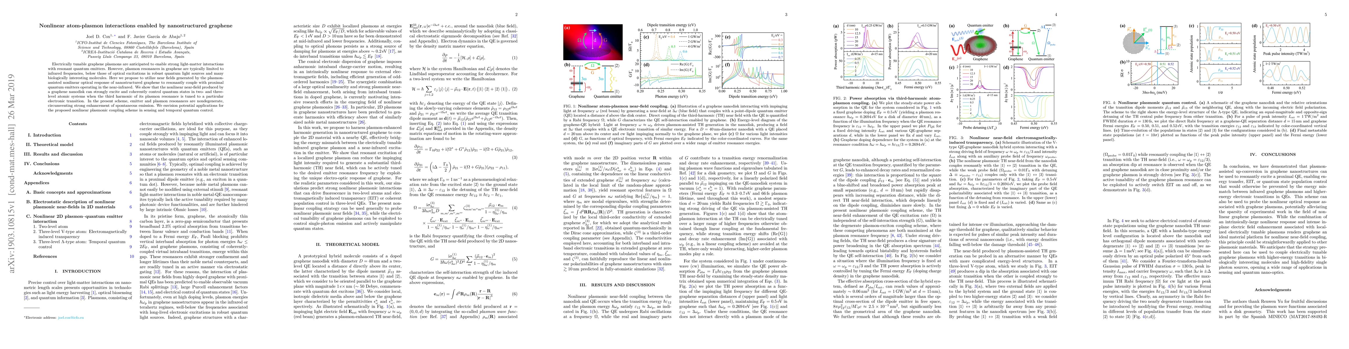 This paper proposes leveraging the nonlinear optical response of nanostructured graphene to enable strong light-matter interactions at near-infrared frequencies, utilizing the third harmonic of graphene plasmon resonances to coherently control quantum states in atomic systems. The method avoids enhancing spontaneous emission, suggesting applications in sensing and quantum control.