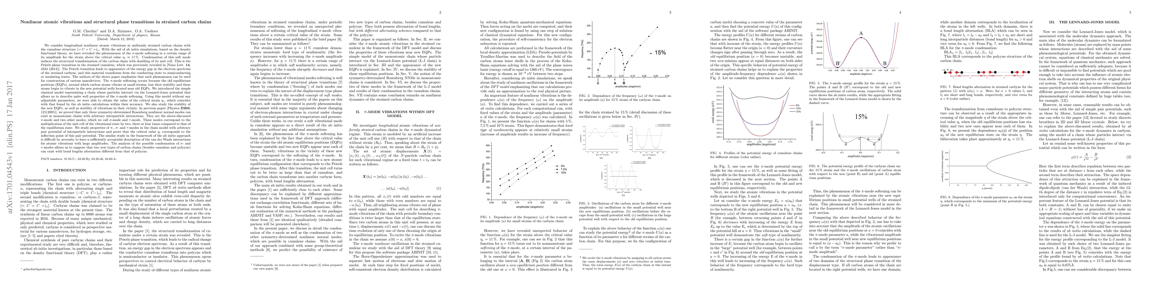 This paper investigates nonlinear atomic vibrations in strained carbon chains, revealing the $\pi$-mode softening phenomenon above a critical strain, leading to a Peierls phase transition and transformation from conducting to semiconducting/insulating states, with potential applications in nanodevices. The study also examines the stability of new equilibrium positions and the properties of three distinct nonlinear normal modes.