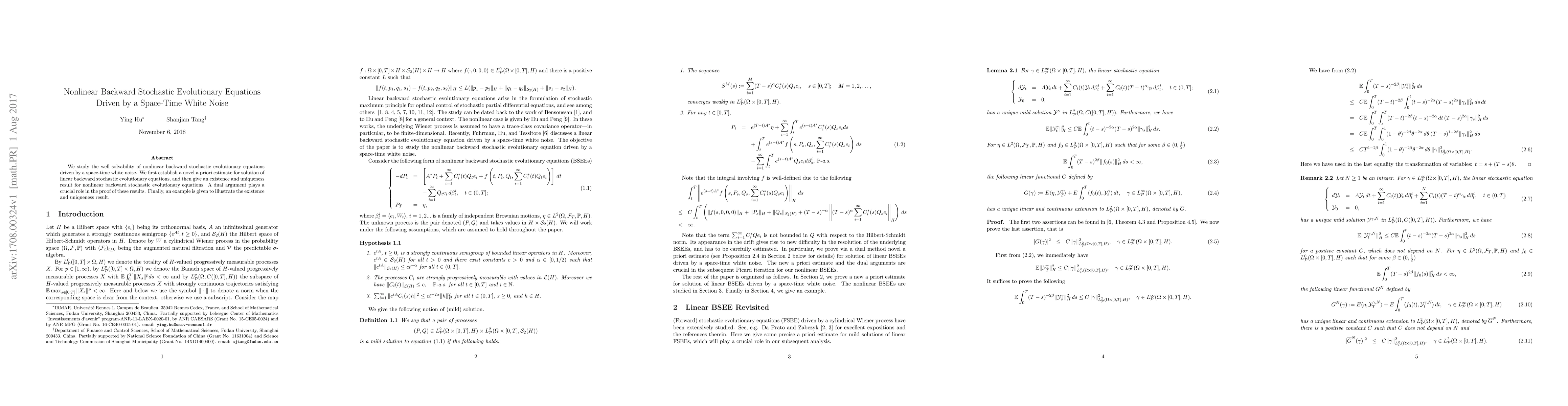 This paper investigates the well-solvability of nonlinear backward stochastic evolutionary equations influenced by space-time white noise, establishing a new a priori estimate for linear equations and proving existence and uniqueness for nonlinear cases using a dual argument. An example is provided to demonstrate these results.