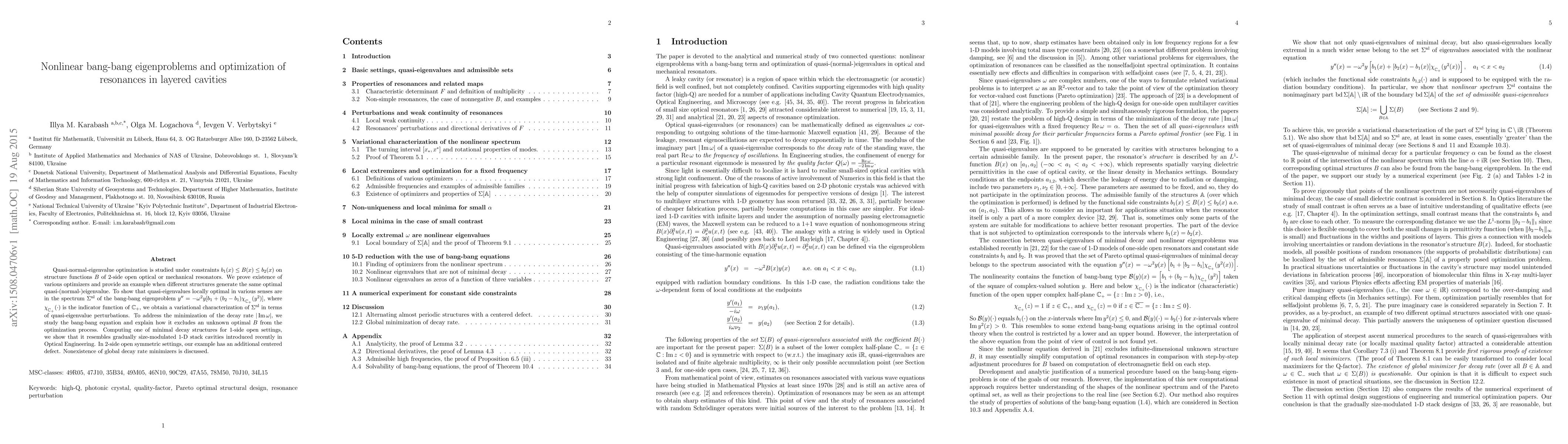Quasi-normal-eigenvalue optimization is studied under constraints $b_1(x) \le B(x) \le b_2 (x)$ on structure functions $B$ of 2-side open optical or mechanical resonators. We prove existence of various optimizers and provide an example when different structures generate the same optimal quasi-(normal-)eigenvalue. To show that quasi-eigenvalues locally optimal in various senses are in the spectrum $\Sigma^{nl}$ of the bang-bang eigenproblem $y" = - \omega^2 y [ b_1 + (b_2 - b_1) \chi_{\mathbb{C}_+} (y^2 ) ]$, where $\chi_{\mathbb{C}_+} (\cdot)$ is the indicator function of the upper complex half-plane $\mathbb{C}_+$, we obtain a variational characterization of the nonlinear spectrum $\Sigma^{nl}$ in terms of quasi-eigenvalue perturbations. To address the minimization of the decay rate $| \mathrm{Im} \ \omega |$, we study the bang-bang equation and explain how it excludes an unknown optimal $B$ from the optimization process. Computing one of minimal decay structures for 1-side open settings, we show that it resembles gradually size-modulated 1-D stack cavities introduced recently in Optical Engineering. In 2-side open symmetric settings, our example has an additional centered defect. Nonexistence of global decay rate minimizers is discussed.
