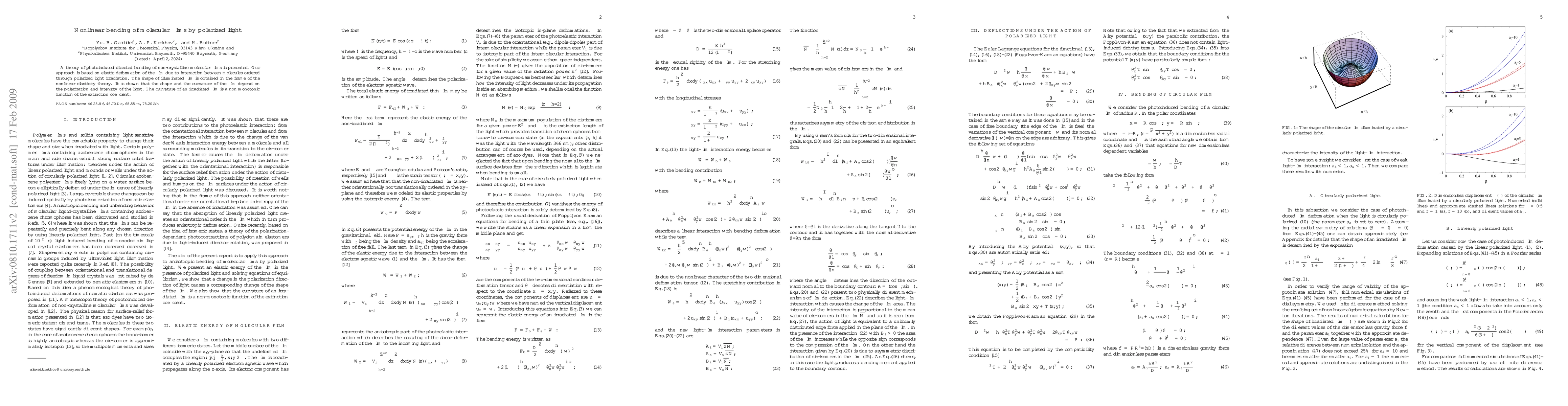 A theory of photoinduced directed bending of non-crystalline molecular films is presented. Our approach is based on elastic deformation of the film due to interaction between molecules ordered through polarized light irradiation. The shape of illuminated film is obtained in the frame of the nonlinear elasticity theory. It is shown that the shape and the curvature of the film depend on the polarization and intensity of the light. The curvature of an irradiated film is a non-monotonic function of the extinction coefficient.