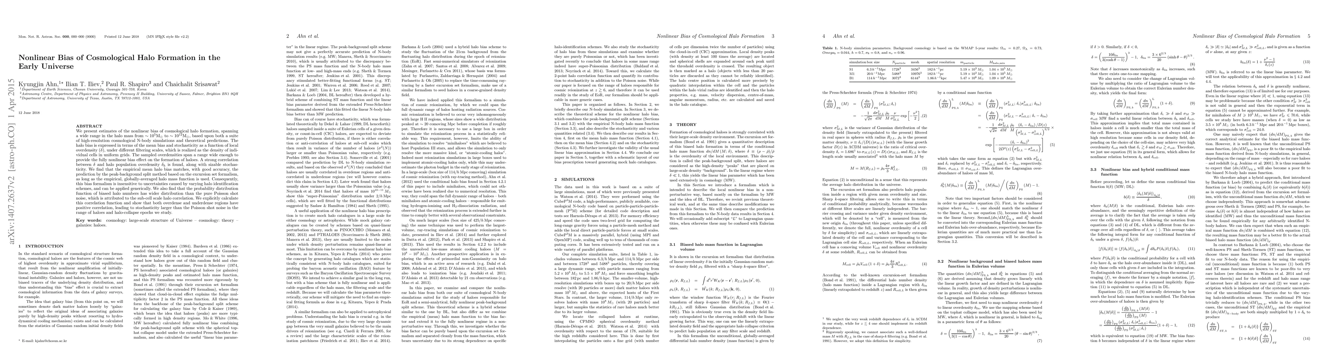 We present estimates of the nonlinear bias of cosmological halo formation, spanning a wide range in the halo mass from $\sim 10^{5} M_\odot$ to $\sim 10^{12} M_\odot$, based upon both a suite of high-resolution cosmological N-body simulations and theoretical predictions. The halo bias is expressed in terms of the mean bias and stochasticity as a function of local overdensity ($\delta$), under different filtering scales, which is realized as the density of individual cells in uniform grids. The sampled overdensities span a range wide enough to provide the fully nonlinear bias effect on the formation of haloes. A strong correlation between $\delta$ and halo population overdensity $\delta_h$ is found, along with sizable stochasticity. We find that the empirical mean halo bias matches, with good accuracy, the prediction by the peak-background split method based on the excursion set formalism, as long as the empirical, globally-averaged halo mass function is used. Consequently, this bias formalism is insensitive to uncertainties caused by varying halo identification schemes, and can be applied generically. We also find that the probability distribution function of biased halo numbers has wider distribution than the pure Poisson shot noise, which is attributed to the sub-cell scale halo correlation. We explicitly calculate this correlation function and show that both overdense and underdense regions have positive correlation, leading to stochasticity larger than the Poisson shot noise in the range of haloes and halo-collapse epochs we study.