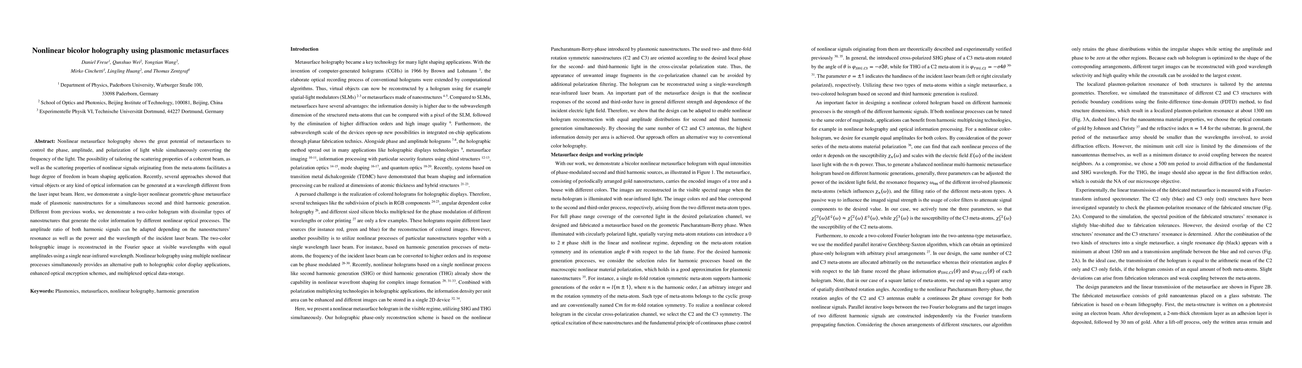 This paper presents a single-layer nonlinear plasmonic metasurface capable of generating a two-color hologram through simultaneous second and third harmonic generation, using different types of nanostructures for each color. The holographic image is reconstructed at visible wavelengths with equal amplitudes from a single near-infrared input, offering potential for advanced holographic displays and data storage.