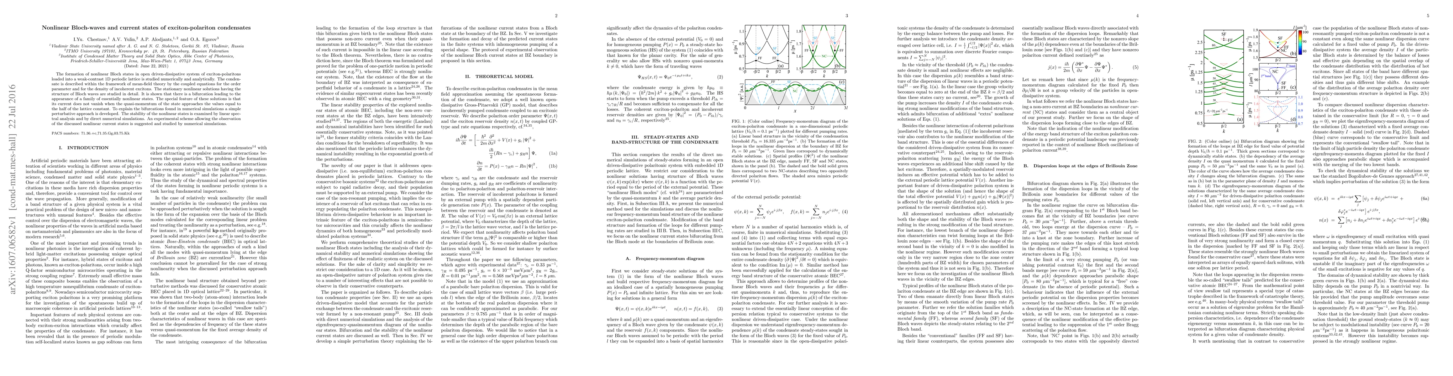 The formation of nonlinear Bloch states in open driven-dissipative system of exciton-polaritons loaded into a weak-contrast 1D periodic lattice is studied numerically and analytically. The condensate is described within the framework of mean-field theory by the coupled equations for the order parameter and for the density of incoherent excitons. The stationary nonlinear solutions having the structure of Bloch waves are studied in detail. It is shown that there is a bifurcation leading to the appearance of a family of essentially nonlinear states. The special feature of these solutions is that its current does not vanish when the quasi-momentum of the state approaches the values equal to the half of the lattice constant. To explain the bifurcations found in numerical simulations a simple perturbative approach is developed. The stability of the nonlinear states is examined by linear spectral analysis and by direct numerical simulations. An experimental scheme allowing the observation of the discussed nonlinear current states is suggested and studied by numerical simulations.