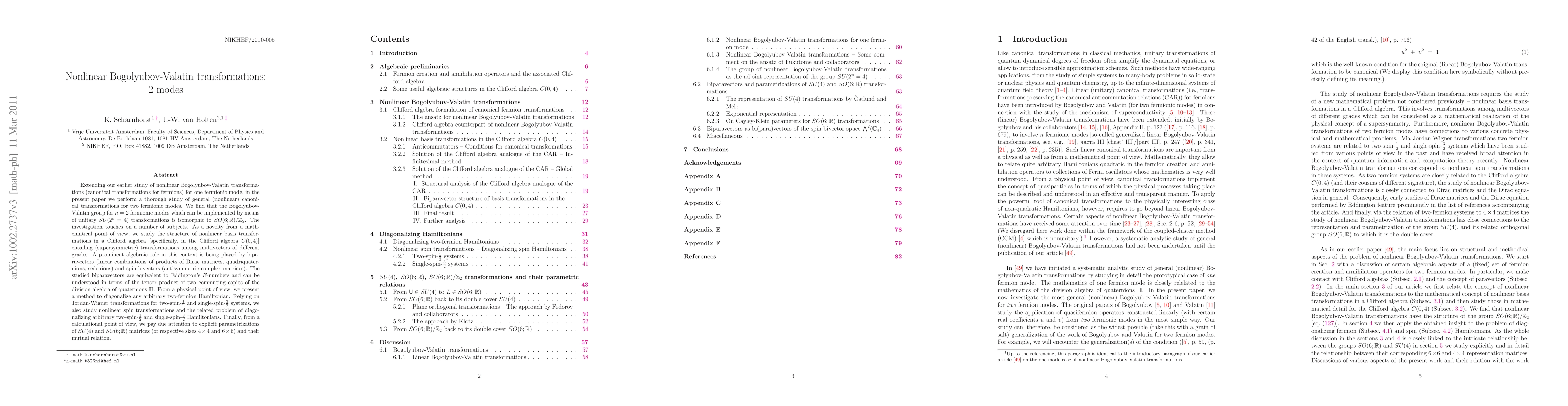 Extending our earlier study of nonlinear Bogolyubov-Valatin transformations (canonical transformations for fermions) for one fermionic mode, in the present paper we perform a thorough study of general (nonlinear) canonical transformations for two fermionic modes. We find that the Bogolyubov-Valatin group for n=2 fermionic modes which can be implemented by means of unitary SU(2^n = 4) transformations is isomorphic to SO(6;R)/Z_2. The investigation touches on a number of subjects. As a novelty from a mathematical point of view, we study the structure of nonlinear basis transformations in a Clifford algebra [specifically, in the Clifford algebra C(0,4)] entailing (supersymmetric) transformations among multivectors of different grades. A prominent algebraic role in this context is being played by biparavectors (linear combinations of products of Dirac matrices, quadriquaternions, sedenions) and spin bivectors (antisymmetric complex matrices). The studied biparavectors are equivalent to Eddington's E-numbers and can be understood in terms of the tensor product of two commuting copies of the division algebra of quaternions H. From a physical point of view, we present a method to diagonalize any arbitrary two-fermion Hamiltonian. Relying on Jordan-Wigner transformations for two-spin-1/2 and single-spin-3/2 systems, we also study nonlinear spin transformations and the related problem of diagonalizing arbitrary two-spin-1/2 and single-spin-3/2 Hamiltonians. Finally, from a calculational point of view, we pay due attention to explicit parametrizations of SU(4) and SO(6;R) matrices (of respective sizes 4x4 and 6x6) and their mutual relation.