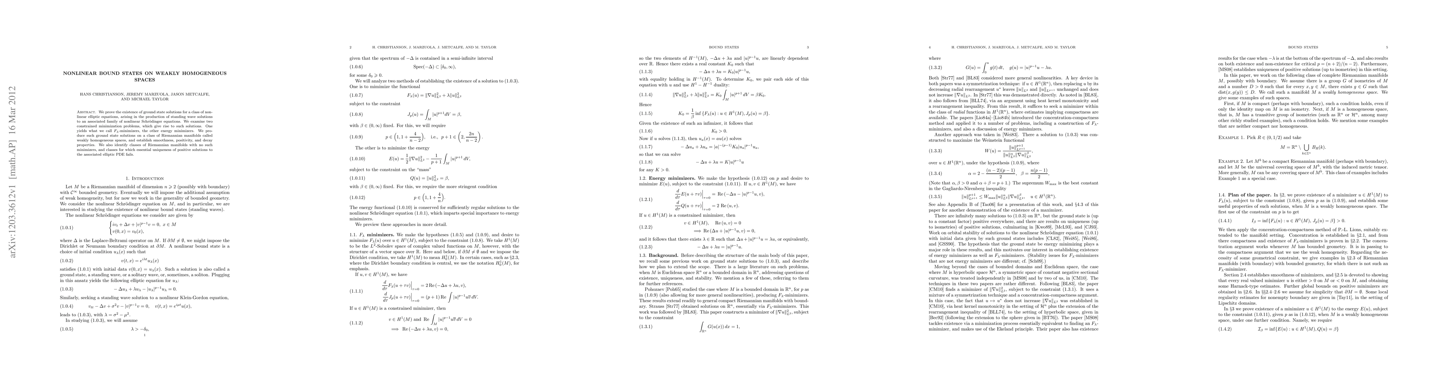 We prove the existence of ground state solutions for a class of nonlinear elliptic equations, arising in the production of standing wave solutions to an associated family of nonlinear Schr\"odinger equations. We examine two constrained minimization problems, which give rise to such solutions. One yields what we call $F_\lambda$-minimizers, the other energy minimizers. We produce such ground state solutions on a class of Riemannian manifolds called weakly homogeneous spaces, and establish smoothness, positivity, and decay properties. We also identify classes of Riemannian manifolds with no such minimizers, and classes for which essential uniqueness of positive solutions to the associated elliptic PDE fails.