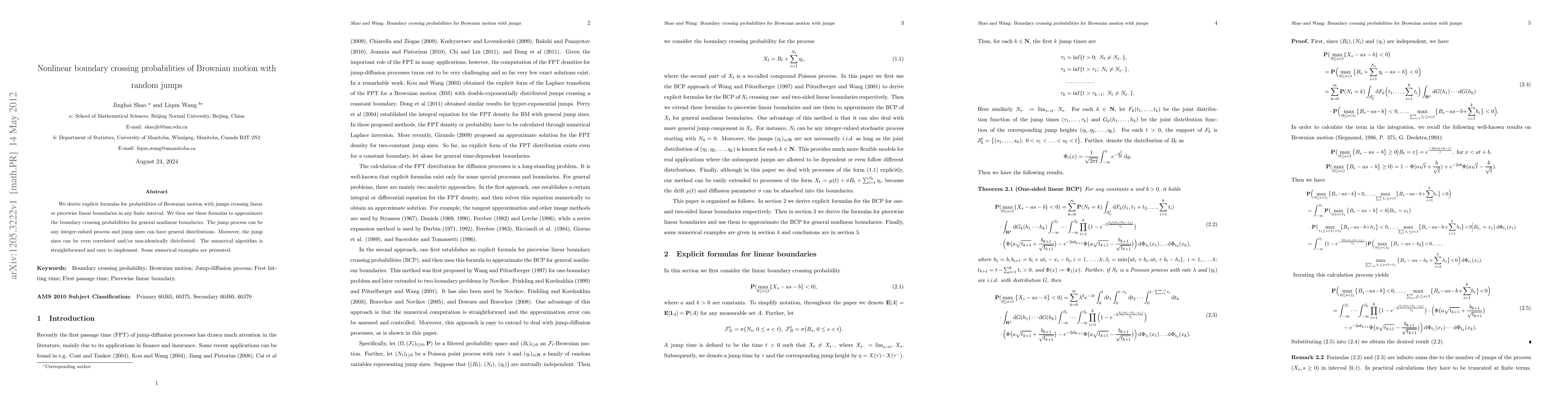 This paper provides explicit formulas for the boundary crossing probabilities of Brownian motion with random jumps, extending the analysis to nonlinear boundaries. The method is versatile, accommodating various jump processes and distributions, and is demonstrated through a straightforward numerical algorithm with presented examples.