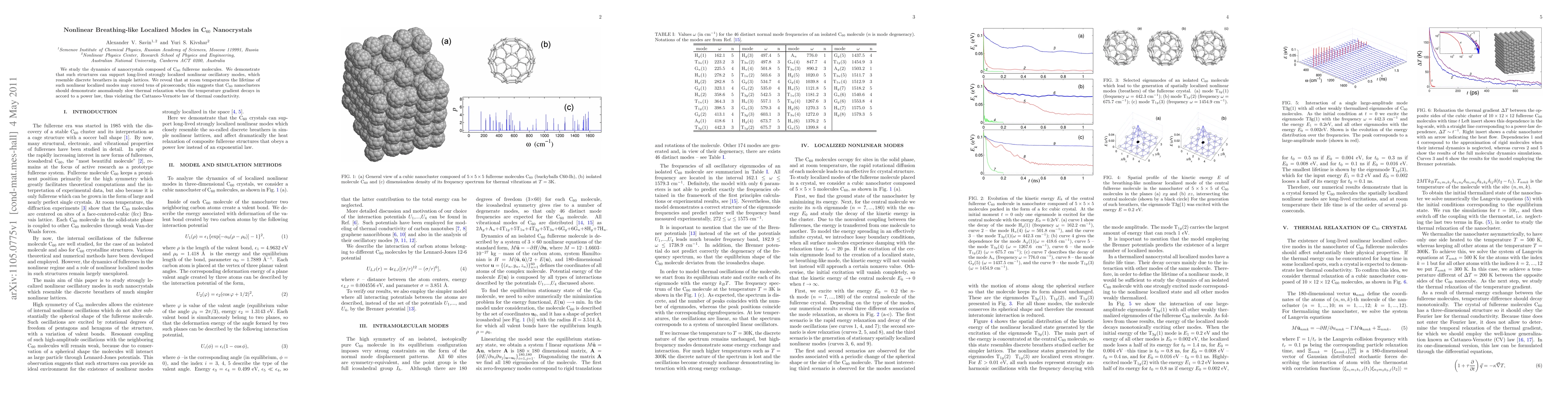 We study the dynamics of nanocrystals composed of C60 fullerene molecules. We demonstrate that such structures can support long-lived strongly localized nonlinear oscillatory modes, which resemble discrete breathers in simple lattices. We reveal that at room temperatures the lifetime of such nonlinear localized modes may exceed tens of picoseconds; this suggests that C60 nanoclusters should demonstrate anomalously slow thermal relaxation when the temperature gradient decays in accord to a power law, thus violating the Cattaneo-Vernotte law of thermal conductivity.