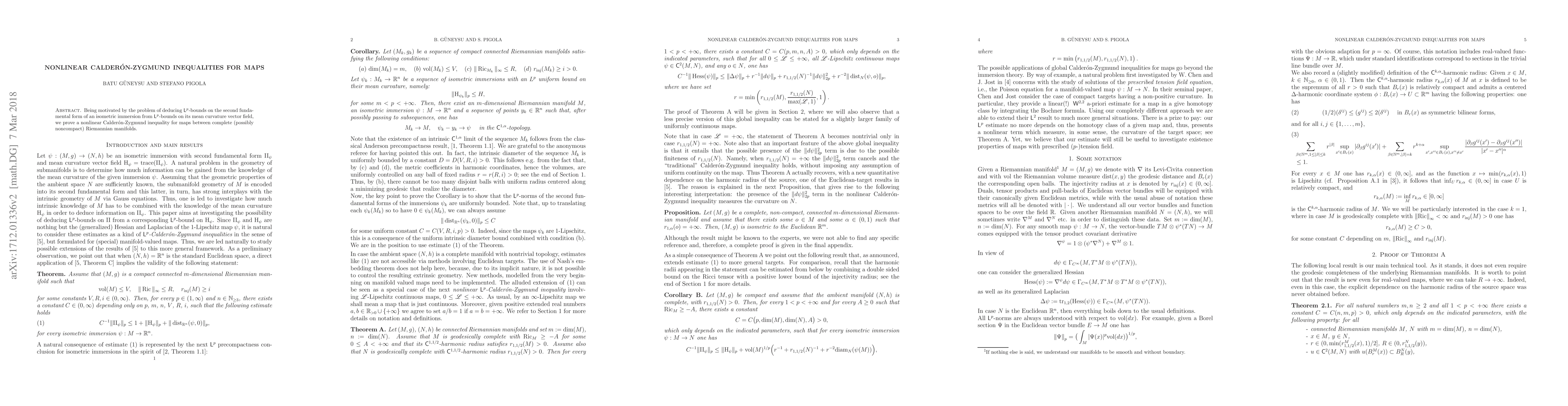 This research establishes a nonlinear Calderón-Zygmund inequality for maps between Riemannian manifolds, providing $L^p$-bounds on the second fundamental form from bounds on the mean curvature vector field. This has implications for understanding geometric properties of isometric immersions.