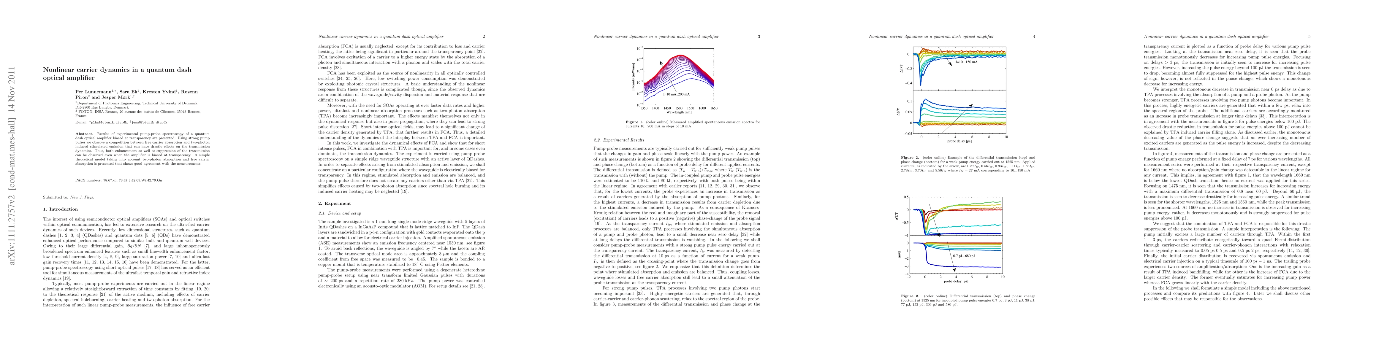 This paper reports experimental observations of nonlinear carrier dynamics in a quantum dash optical amplifier, revealing competition between free carrier absorption and two-photon induced stimulated emission. A theoretical model accurately predicts the observed transmission dynamics, highlighting both enhancement and suppression effects even at transparency bias.