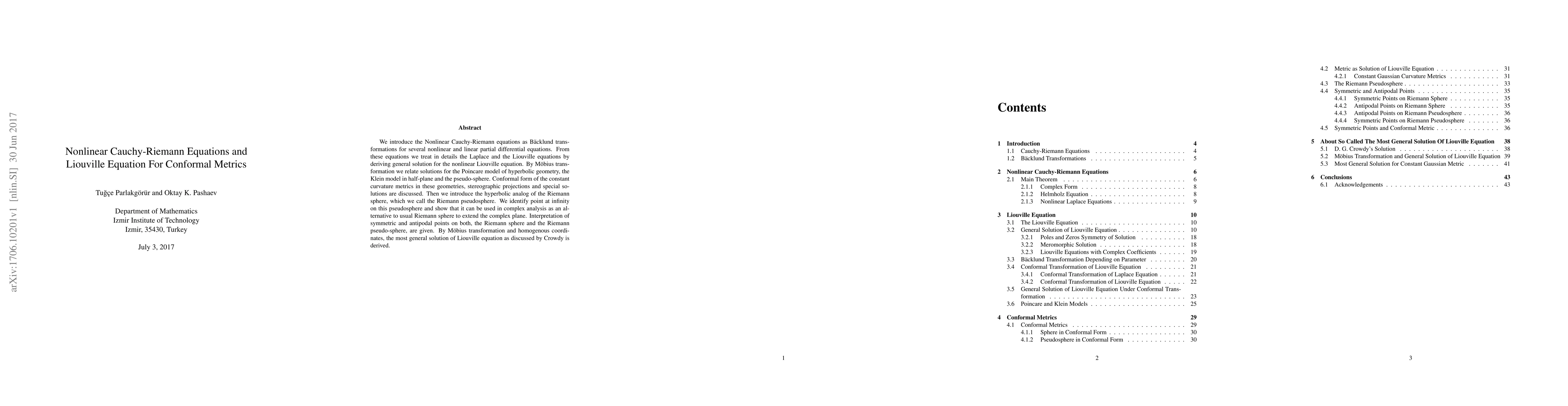 This paper explores Nonlinear Cauchy-Riemann equations as Bäcklund transformations and derives general solutions for the nonlinear Liouville equation. It discusses conformal metrics in hyperbolic geometry and introduces the Riemann pseudosphere as an alternative to the Riemann sphere in complex analysis.