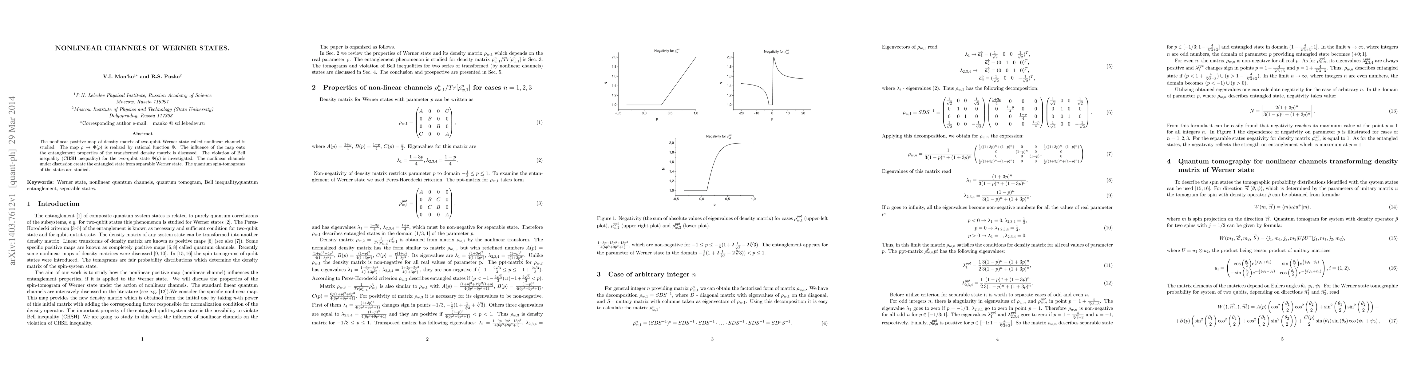 Researchers studied how a nonlinear channel affects entanglement properties of a two-qubit Werner state, finding it creates an entangled state from a separable one and violating the Bell inequality.