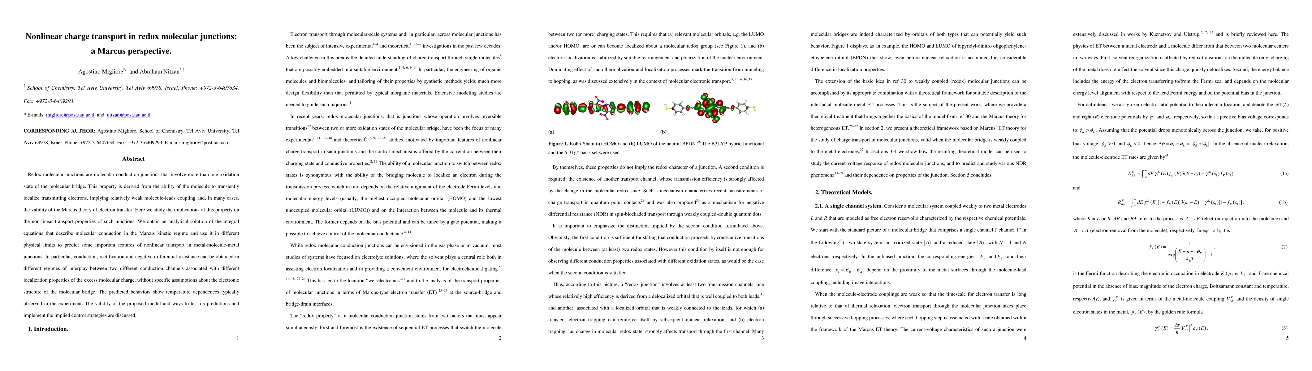 This paper investigates nonlinear charge transport in redox molecular junctions through a Marcus theory perspective, deriving an analytical solution for the kinetic regime. It predicts conduction, rectification, and negative differential resistance based on the interplay between different charge localization states, showing temperature dependences consistent with experimental observations.