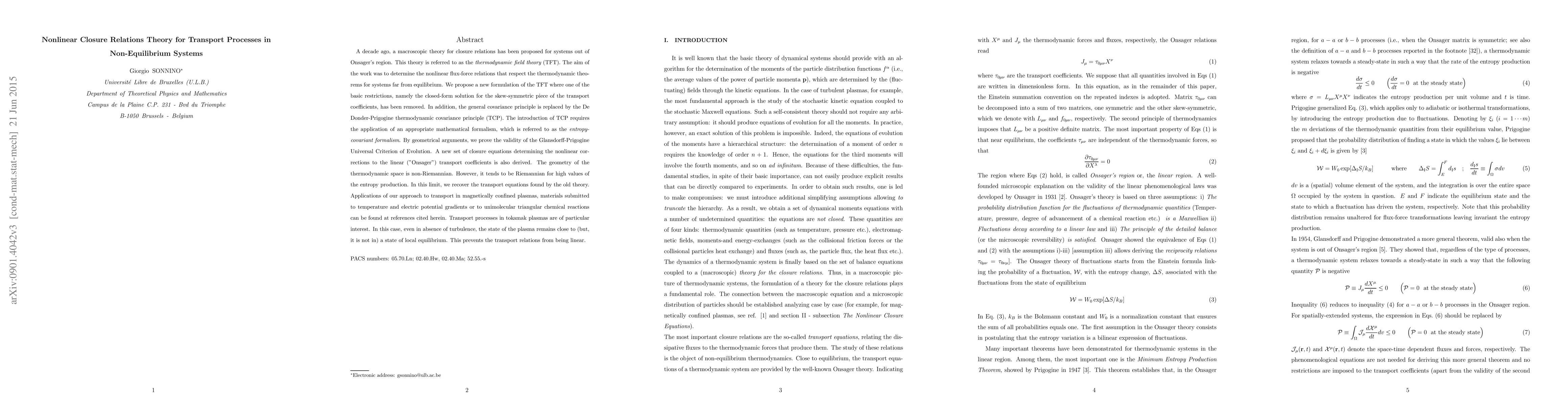 A decade ago, a macroscopic theory for closure relations has been proposed for systems out of Onsager's region. This theory is referred to as the "Thermodynamic Field Theory" (TFT). The aim of the work was to determine the nonlinear flux-force relations that respect the thermodynamic theorems for systems far from equilibrium. We propose a new formulation of the TFT where one of the basic restrictions, namely the closed-form solution for the skew-symmetric piece of the transport coefficients, has been removed. In addition, the general covariance principle is replaced by the De Donder-Prigogine thermodynamic covariance principle (TCP). The introduction of TCP requires the application of an appropriate mathematical formalism, which is referred to as the "entropy-covariant formalism". By geometrical arguments, we prove the validity of the Glansdorff-Prigogine Universal Criterion of Evolution. A new set of closure equations determining the nonlinear corrections to the linear ("Onsager") transport coefficients is also derived. The geometry of the thermodynamic space is non-Riemannian. However, it tends to be Riemannian for high values of the entropy production. In this limit, we recover the transport equations found by the old theory. Applications of our approach to transport in magnetically confined plasmas, materials submitted to temperature and electric potential gradients or to unimolecular triangular chemical reactions can be found at references cited herein. Transport processes in tokamak plasmas are of particular interest. In this case, even in absence of turbulence, the state of the plasma remains close to (but, it is not in) a state of local equilibrium. This prevents the transport relations from being linear.