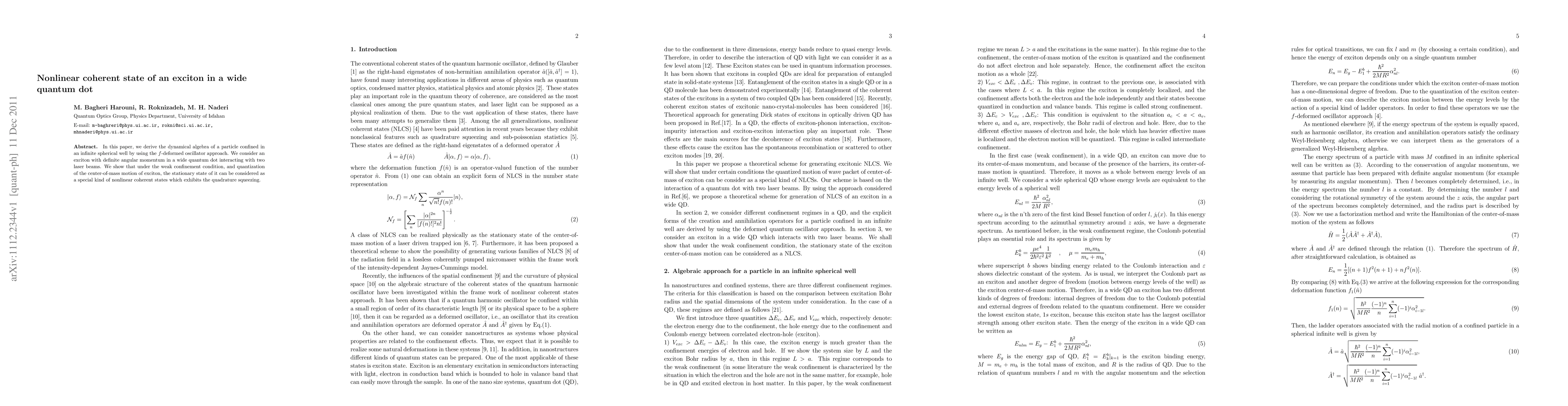 In this paper, we derive the dynamical algebra of a particle confined in an infinite spherical well by using the $f$-deformed oscillator approach. We consider an exciton with definite angular momentum in a wide quantum dot interacting with two laser beams. We show that under the weak confinement condition, and quantization of the center-of-mass motion of exciton, the stationary state of it can be considered as a special kind of nonlinear coherent states which exhibits the quadrature squeezing.