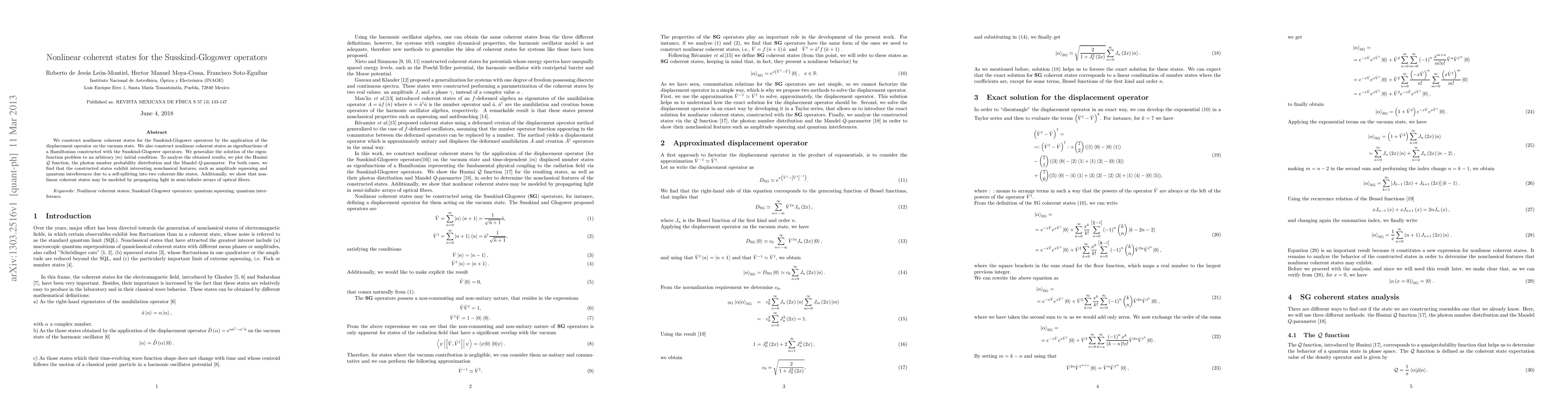 The research constructs nonlinear coherent states for Susskind-Glogower operators using displacement operator on the vacuum state and as eigenfunctions of a Hamiltonian built with these operators. The solution is generalized for an arbitrary initial condition |mi and analyzed using Husimi Q function, photon number probability distribution, and Mandel Q-parameter.