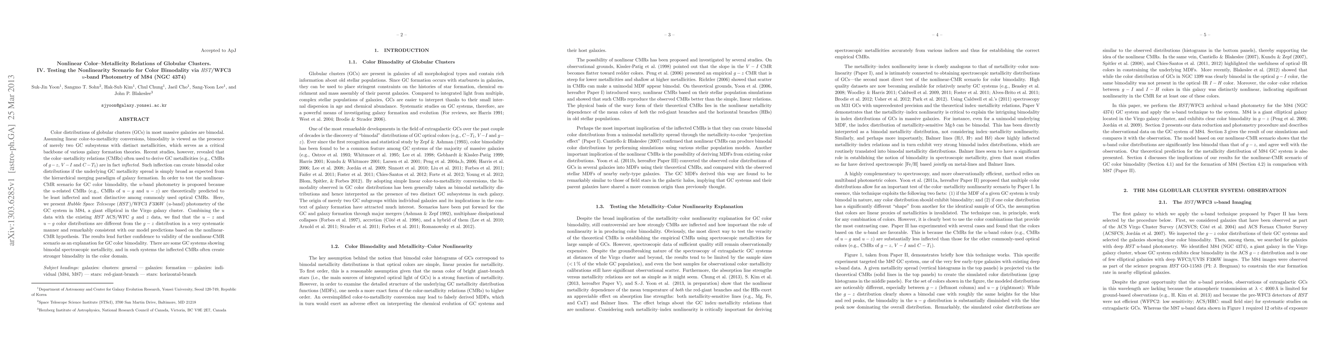 This paper investigates the nonlinear color-metallicity relations (CMRs) of globular clusters (GCs) in M84 using HST/WFC3 u-band photometry, finding that the u-related CMRs support the nonlinear-CMR hypothesis for GC color bimodality. The results suggest that bimodal color distributions may arise from broad metallicity spreads rather than distinct GC subsystems.
