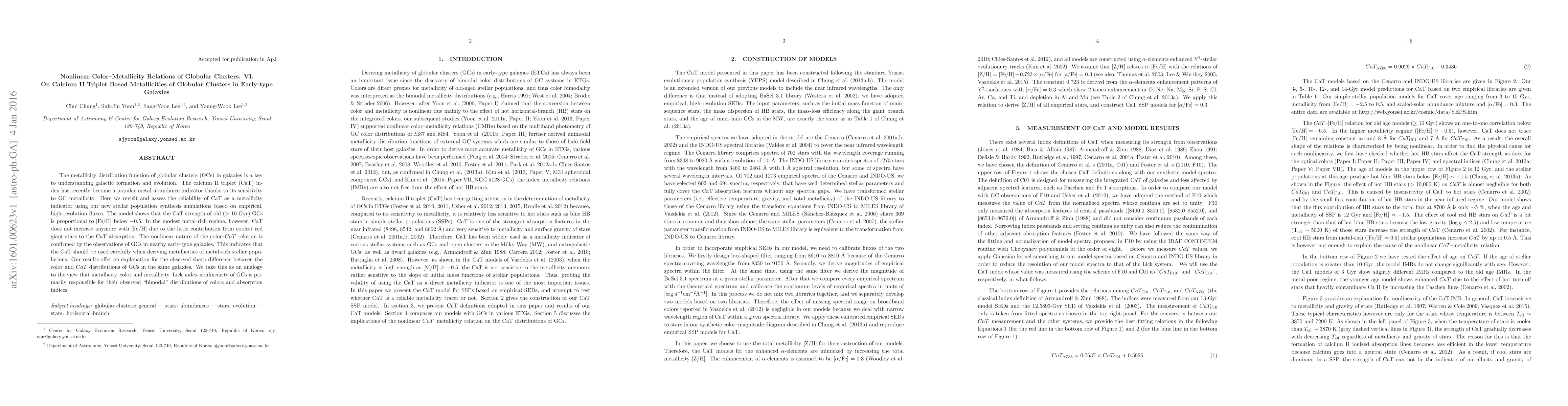 The metallicity distribution function of globular clusters (GCs) in galaxies is a key to understanding galactic formation and evolution. The calcium II triplet (CaT) index has recently become a popular metal abundance indicator thanks to its sensitivity to GC metallicity. Here we revisit and assess the reliability of CaT as a metallicity indicator using our new stellar population synthesis simulations based on empirical, high-resolution fluxes. The model shows that the CaT strength of old ($>$ 10 Gyr) GCs is proportional to ${\rm [Fe/H]}$ below $-0.5$. In the modest metal-rich regime, however, CaT does not increase anymore with ${\rm [Fe/H]}$ due to the little contribution from coolest red giant stars to the CaT absorption. The nonlinear nature of the color--$CaT$ relation is confirmed by the observations of GCs in nearby early-type galaxies. This indicates that the CaT should be used carefully when deriving metallicities of metal-rich stellar populations. Our results offer an explanation for the observed sharp difference between the color and $CaT$ distributions of GCs in the same galaxies. We take this as an analogy to the view that metallicity--color and metallicity--Lick index nonlinearity of GCs is primarily responsible for their observed "bimodal" distributions of colors and absorption indices.