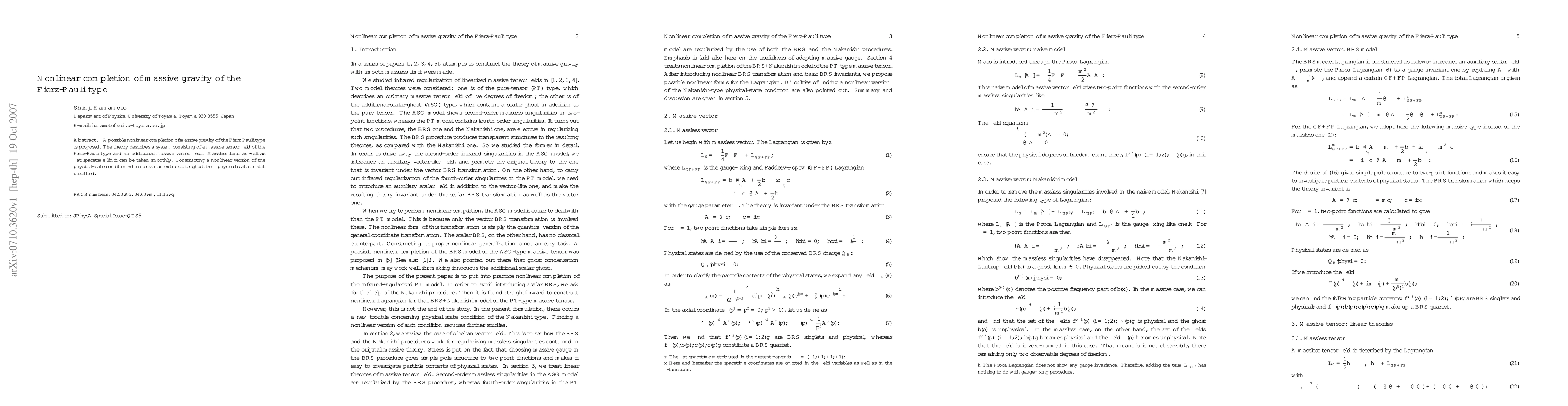 This paper proposes a nonlinear completion for massive gravity of the Fierz-Pauli type, introducing a system with both a massive tensor field and an additional massive vector field. The theory maintains smooth transitions to the massless and flat-spacetime limits, yet the challenge of eliminating an extra scalar ghost from physical states remains unresolved.