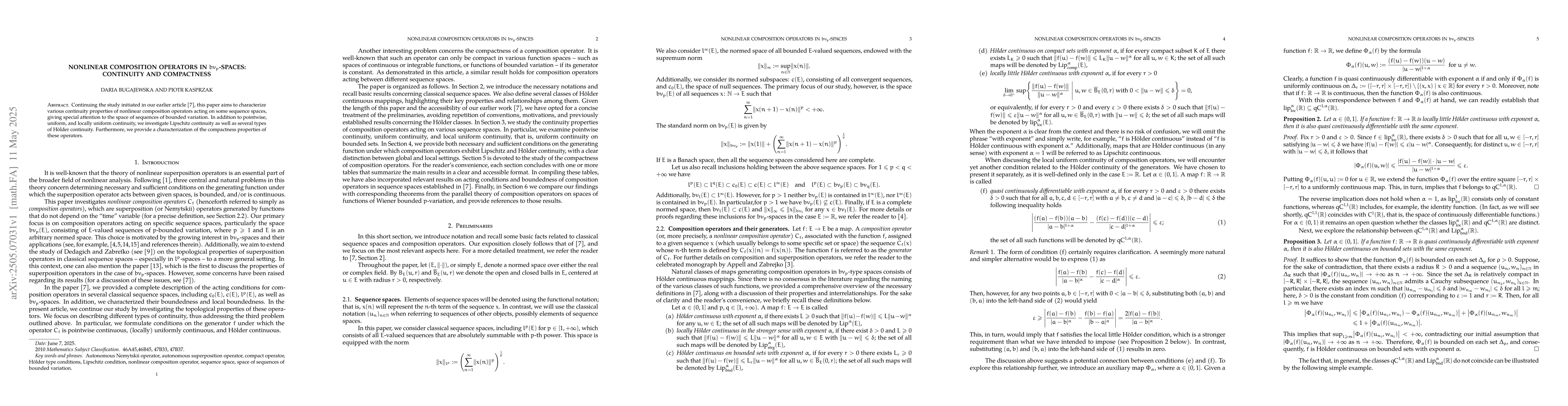 The paper investigates nonlinear composition operators on sequence spaces, focusing on the space of sequences of bounded variation, and examines continuity properties such as pointwise, uniform, locally uniform, Lipschitz, and Hölder continuities.