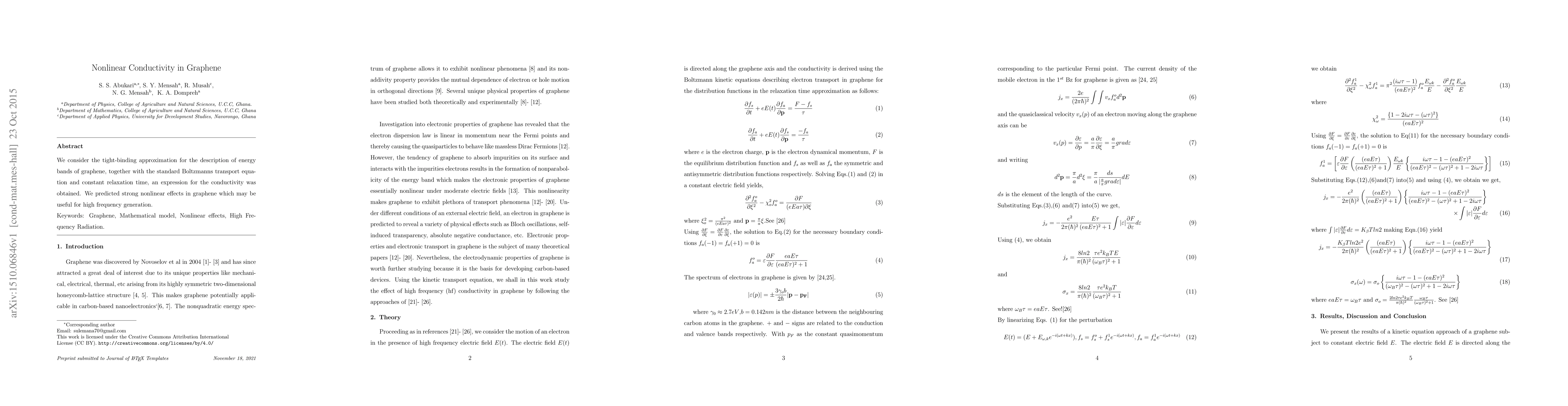 This paper uses tight-binding approximation and the Boltzmann transport equation to derive conductivity in graphene, predicting significant nonlinear effects that could enable high-frequency generation applications.
