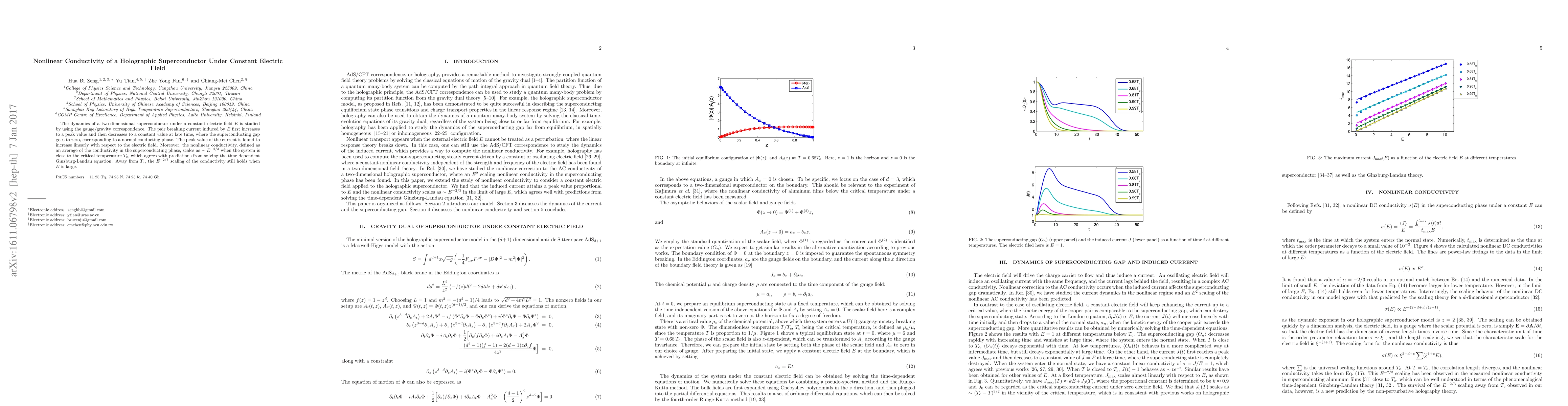 The dynamics of a two-dimensional superconductor under a constant electric field $E$ is studied by using the gauge/gravity correspondence. The pair breaking current induced by $E$ first increases to a peak value and then decreases to a constant value at late time, where the superconducting gap goes to zero, corresponding to a normal conducting phase. The peak value of the current is found to increase linearly with respect to the electric field. Moreover, the nonlinear conductivity, defined as an average of the conductivity in the superconducting phase, scales as $\sim E^{-2/3}$ for large $E$ when the system is close to the critical temperature, which agrees with predictions from solving the time dependent Ginzburg-Landau equation.