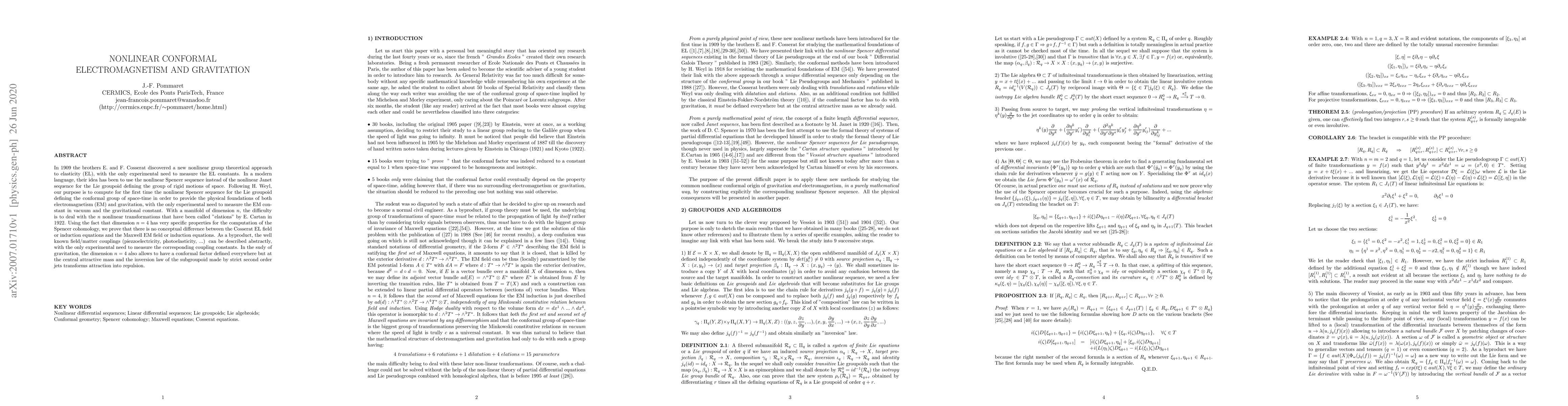 In 1909 the brothers E. and F. Cosserat discovered a new nonlinear group theoretical approach to elasticity (EL), with the only experimental need to measure the EL constants. In a modern language, their idea has been to use the nonlinear Spencer sequence instead of the nonlinear Janet sequence for the Lie groupoid defining the group of rigid motions of space. Following H. Weyl, our purpose is to compute for the first time the nonlinear Spencer sequence for the Lie groupoid defining the conformal group of space-time in order to provide the physical foundations of both electromagnetism (EM) and gravitation, with the only experimental need to measure the EM constant in vacuum and the gravitational constant. With a manifold of dimension $n$, the difficulty is to deal with the $n$ nonlinear transformations that have been called "elations" by E. Cartan in 1922. Using the fact that dimension $n=4$ has very specific properties for the computation of the Spencer cohomology, we prove that there is no conceptual difference between the Cosserat EL field or induction equations and the Maxwell EM field or induction equations. As a byproduct, the well known field/matter couplings (piezzoelectricity, photoelasticity, ...) can be described abstractly, with the only experimental need to measure the corresponding coupling constants. In the sudy of gravitation, the dimension $n=4$ also allows to have a conformal factor defined everywhere but at the central attractive mass and the inversion law of the subgroupoid made by strict second order jets transforms attraction into repulsion.