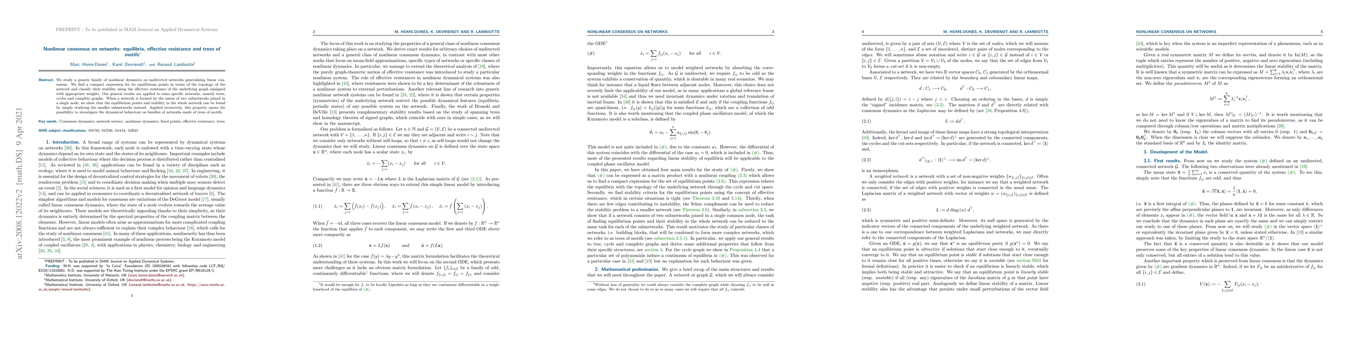 We study a generic family of nonlinear dynamics on undirected networks generalising linear consensus. We find a compact expression for its equilibrium points in terms of the topology of the network and classify their stability using the effective resistance of the underlying graph equipped with appropriate weights. Our general results are applied to some specific networks, namely trees, cycles and complete graphs. When a network is formed by the union of two subnetworks joined in a single node, we show that the equilibrium points and stability in the whole network can be found by simply studying the smaller subnetworks instead. Applied recursively, this property opens the possibility to investigate the dynamical behaviour on families of networks made of trees of motifs.