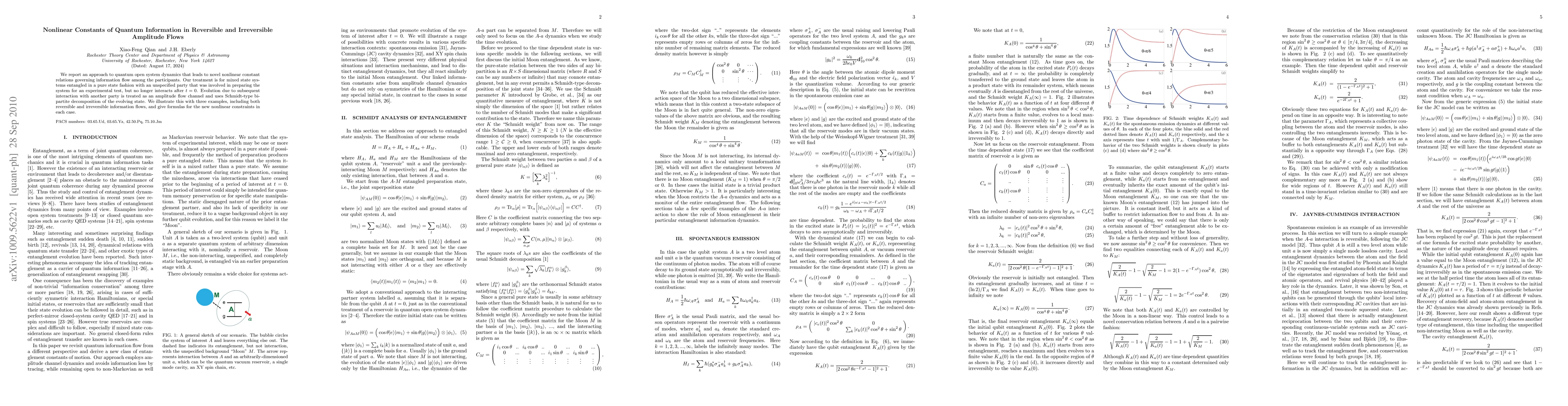 We report an approach to quantum open system dynamics that leads to novel nonlinear constant relations governing information flow among the participants. Our treatment is for mixed state systems entangled in a pure state fashion with an unspecified party that was involved in preparing the system for an experimental test, but no longer interacts after $t=0$. Evolution due to subsequent interaction with another party is treated as an amplitude flow channel and uses Schmidt-type bipartite decomposition of the evolving state. We illustrate this with three examples, including both reversible and irreversible information flows, and give formulas for the new nonlinear constraints in each case.