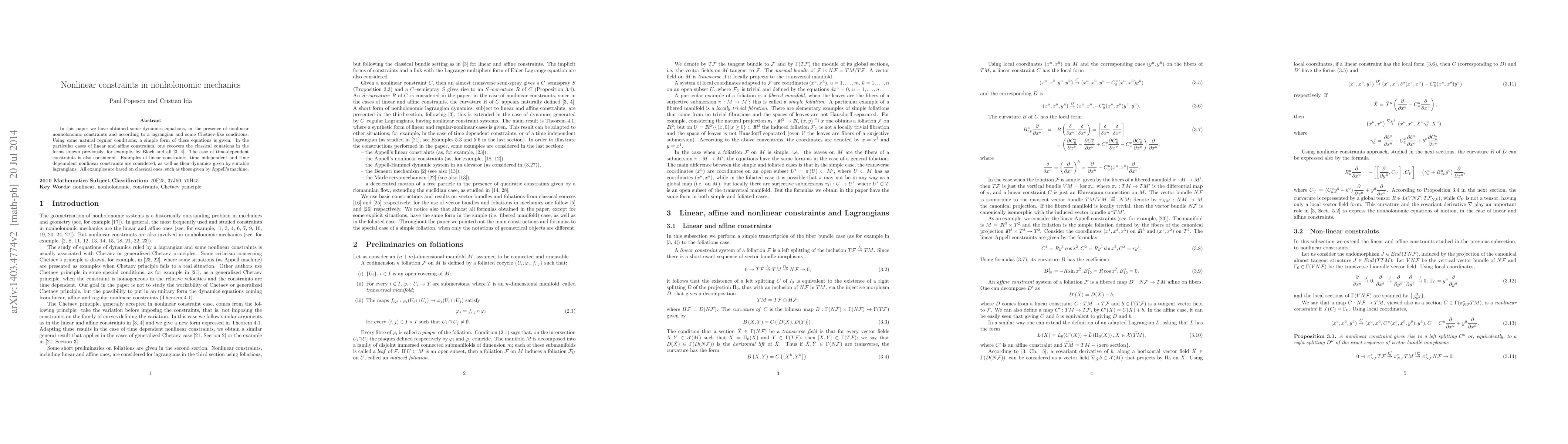 In this paper we have obtained some dynamics equations, in the presence of nonlinear nonholonomic constraints and according to a lagrangian and some Chetaev-like conditions. Using some natural regular conditions, a simple form of these equations is given. In the particular cases of linear and affine constraints, one recovers the classical equations in the forms known previously, for example, by Bloch and all \cite {Bl, BKMM}. The case of time-dependent constraints is also considered. Examples of linear constraints, time independent and time depenndent nonlinear constraints are considered, as well as their dynamics given by suitable lagrangians. All examples are based on classical ones, such as those given by Appell's machine.