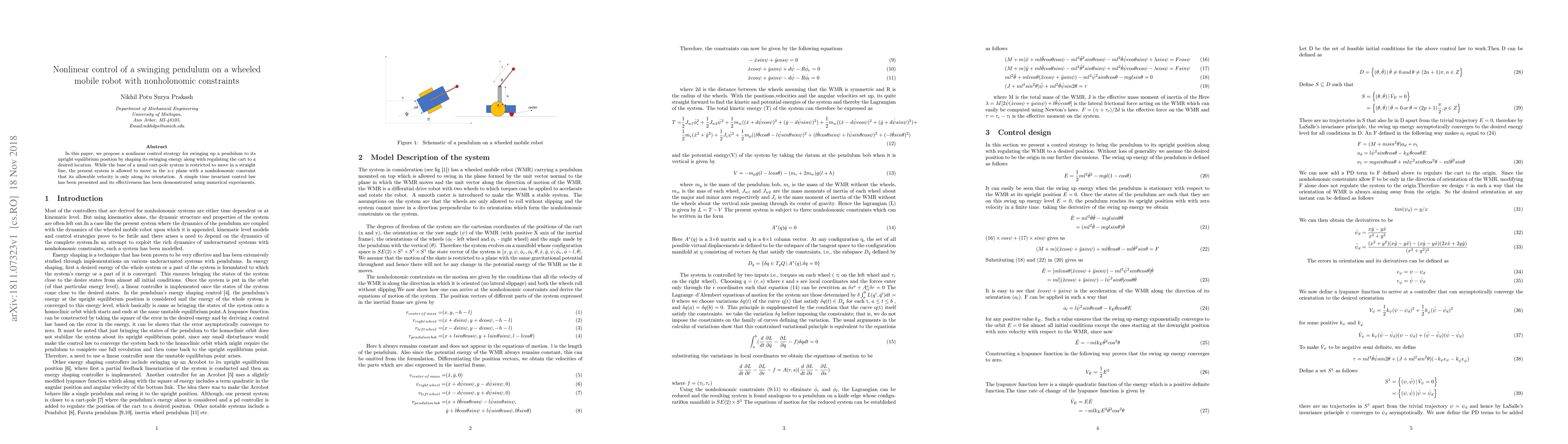 Researchers propose a nonlinear control strategy to swing up a pendulum on a wheeled mobile robot while regulating its movement in the x-y plane with nonholonomic constraints.