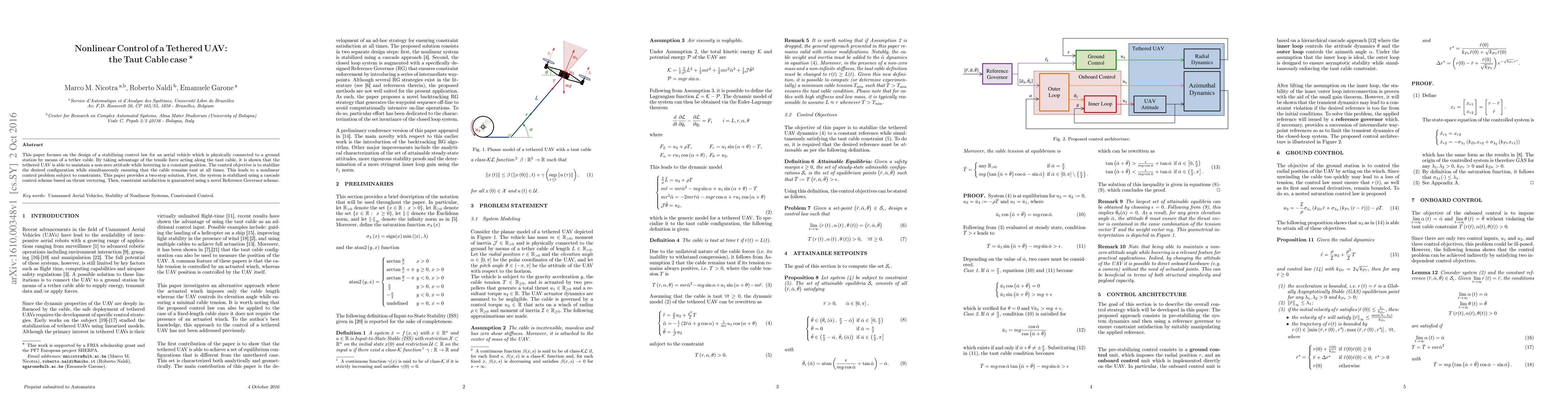 This paper designs a stabilizing control law for a tethered UAV using thrust vectoring and a Reference Governor scheme to maintain a taut cable while hovering in a constant position and non-zero attitude. The approach addresses a nonlinear control problem with constraints.