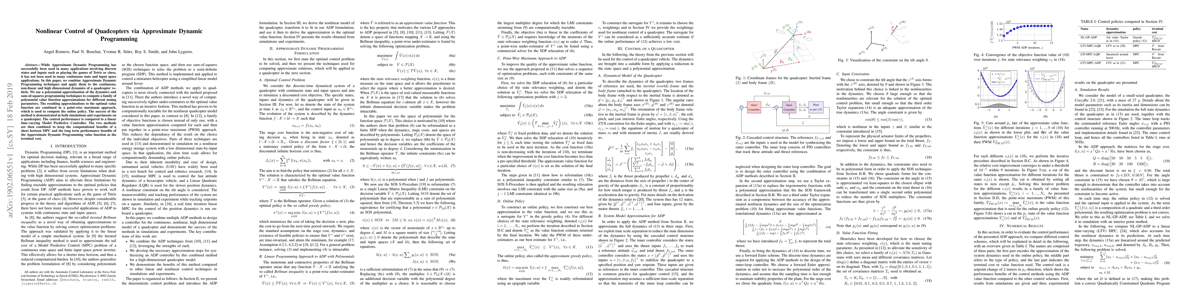 This paper applies Approximate Dynamic Programming to control quadcopters, using polynomial approximations and sum-of-squares programming for optimal value function computation. The method is shown to outperform a linear time-varying Model Predictive Controller in both simulation and real-world experiments.