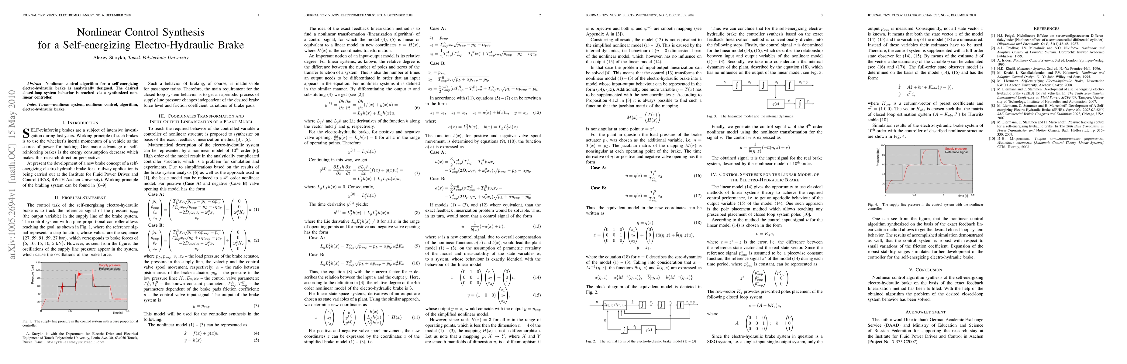 Nonlinear control algorithm for a self-energizing electro-hydraulic brake is analytically designed. The desired closed-loop system behavior is reached via a synthesized nonlinear controller.