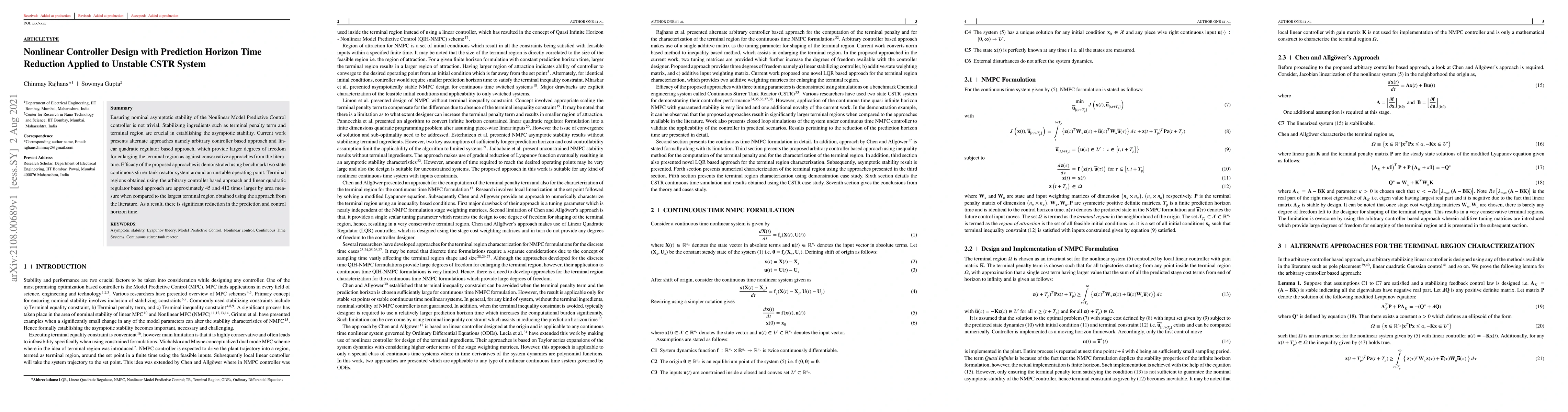 Ensuring nominal asymptotic stability of the Nonlinear Model Predictive Control controller is not trivial. Stabilizing ingredients such as terminal penalty term and terminal region are crucial in establishing the asymptotic stability. Current work presents alternate approaches namely arbitrary controller based approach and linear quadratic regulator based approach, which provide larger degrees of freedom for enlarging the terminal region as against conservative approaches from the literature. Efficacy of the proposed approaches is demonstrated using benchmark two state continuous stirrer tank reactor system around an unstable operating point. Terminal regions obtained using the arbitrary controller based approach and linear quadratic regulator based approach are approximately 45 and 412 times larger by area measure when compared to the largest terminal region obtained using the approach from the literature. As a result, there is significant reduction in the prediction and control horizon time.