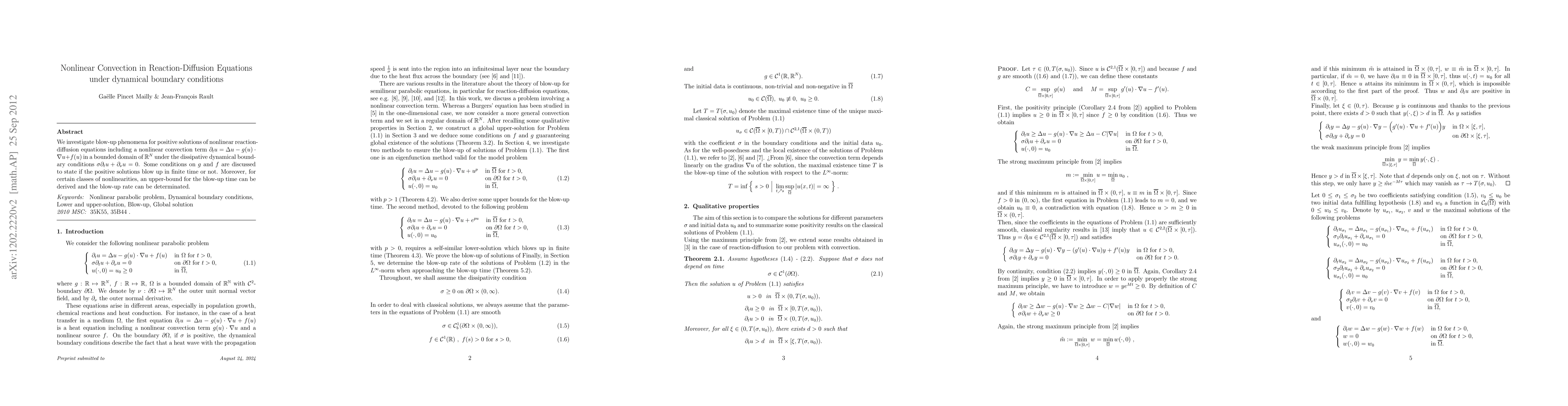 This paper examines blow-up phenomena in positive solutions of nonlinear reaction-diffusion equations with a convection term under dissipative dynamical boundary conditions. It determines conditions under which solutions blow up in finite time and derives an upper-bound for the blow-up time and the blow-up rate for specific nonlinearities.