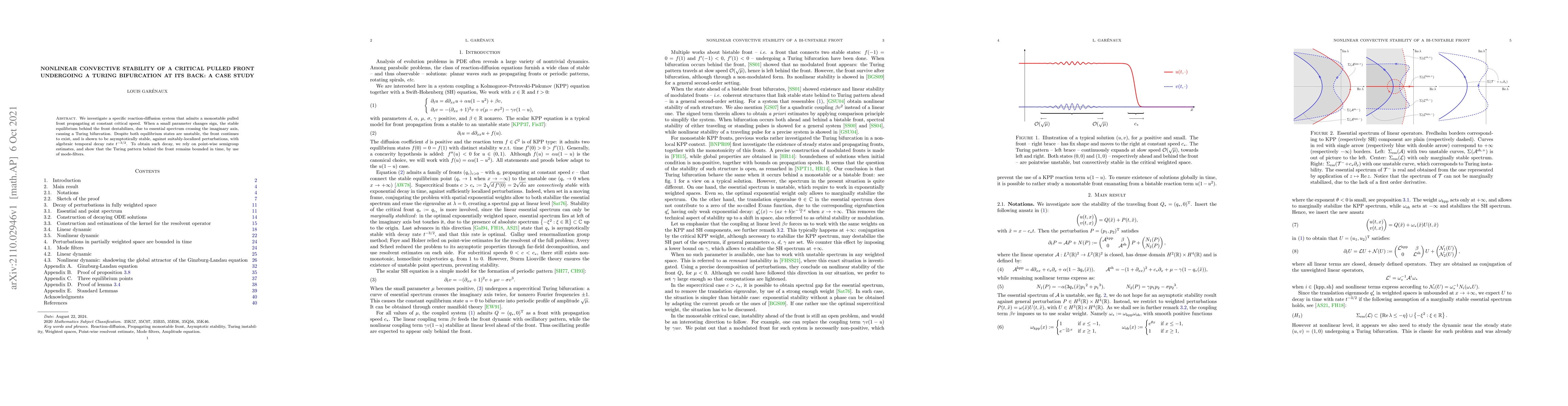 We investigate a specific reaction-diffusion system that admits a monostable pulled front propagating at constant critical speed. When a small parameter changes sign, the stable equilibrium behind the front destabilizes, due to essential spectrum crossing the imaginary axis, causing a Turing bifurcation. Despite both equilibrium states are unstable, the front continues to exist, and is shown to be asymptotically stable, against suitably-localized perturbations, with algebraic temporal decay rate $t^{-3/2}$. To obtain such decay, we rely on point-wise semigroup estimates, and show that the Turing pattern behind the front remains bounded in time, by use of mode-filters.