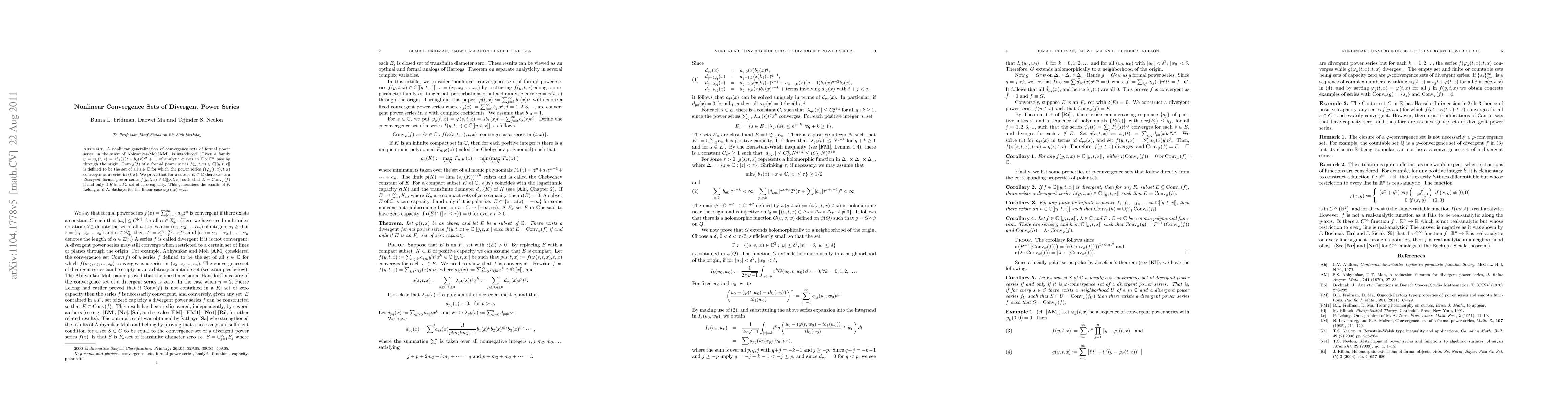 This paper introduces a nonlinear generalization of convergence sets of formal power series, proving that a subset E of the complex plane is the convergence set of a divergent power series if and only if E is a Fσ set of zero capacity, extending previous linear results.