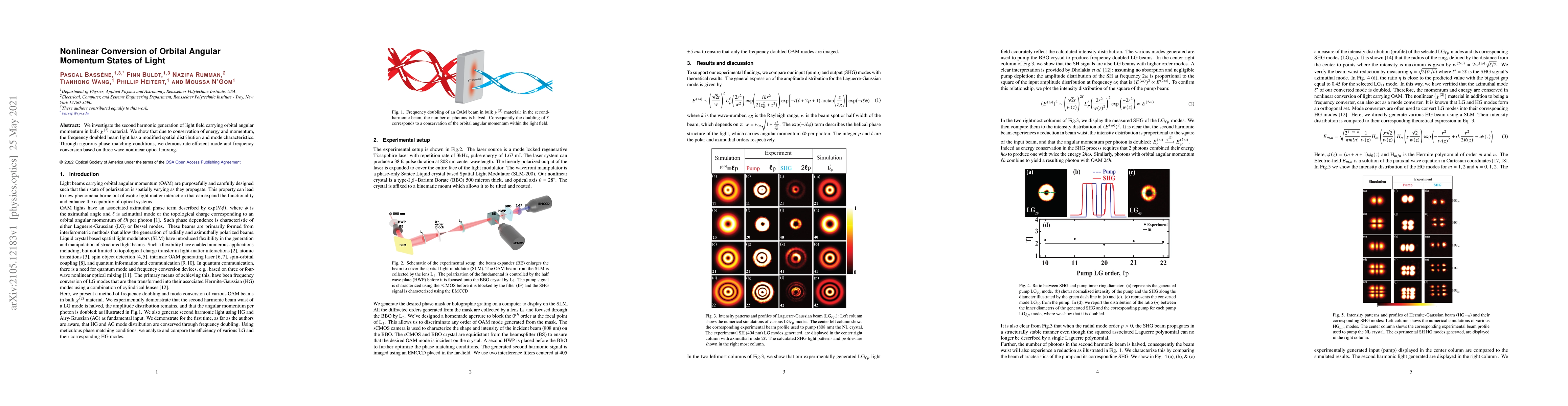 This paper explores the second harmonic generation of orbital angular momentum states in bulk $\chi^{(2)}$ materials, revealing that the frequency-doubled light exhibits a modified spatial distribution and mode characteristics due to energy and momentum conservation. Efficient mode and frequency conversion is achieved through precise phase matching conditions in three-wave nonlinear optical mixing.
