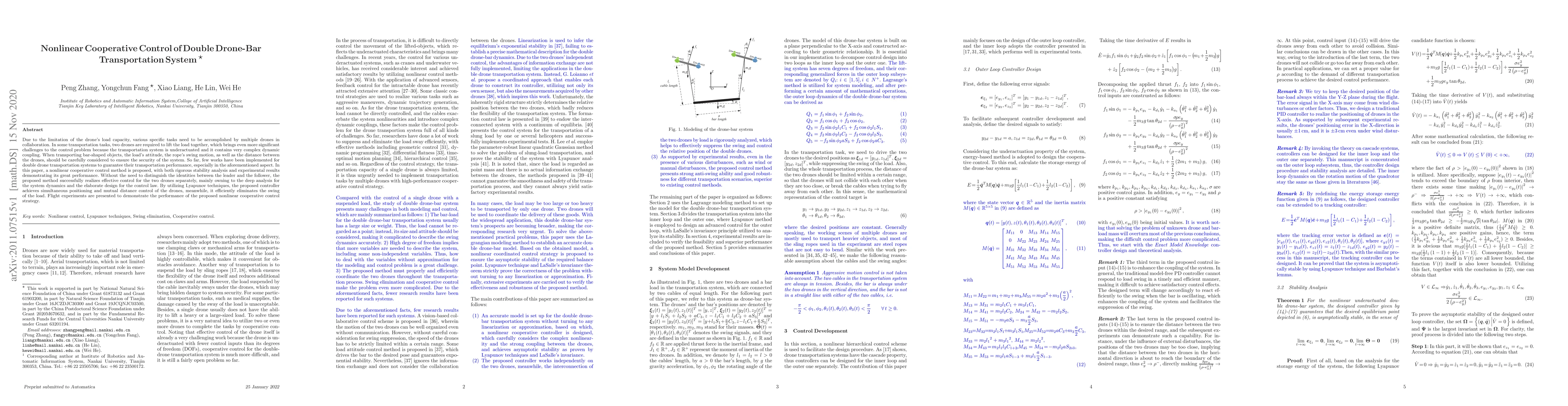 Due to the limitation of the drone's load capacity, various specific tasks need to be accomplished by multiple drones in collaboration. In some transportation tasks, two drones are required to lift the load together, which brings even more significant challenges to the control problem because the transportation system is underactuated and it contains very complex dynamic coupling. When transporting bar-shaped objects, the load's attitude, the rope's swing motion, as well as the distance between the drones, should be carefully considered to ensure the security of the system. So far, few works have been implemented for double drone transportation systems to guarantee their transportation performance, especially in the aforementioned aspect. In this paper, a nonlinear cooperative control method is proposed, with both rigorous stability analysis and experimental results demonstrating its great performance. Without the need to distinguish the identities between the leader and the follower, the proposed method successfully realizes effective control for the two drones separately, mainly owning to the deep analysis for the system dynamics and the elaborate design for the control law. By utilizing Lyapunov techniques, the proposed controller achieves simultaneous positioning and mutual distance control of the drones, meanwhile, it efficiently eliminates the swing of the load. Flight experiments are presented to demonstrate the performance of the proposed nonlinear cooperative control strategy.