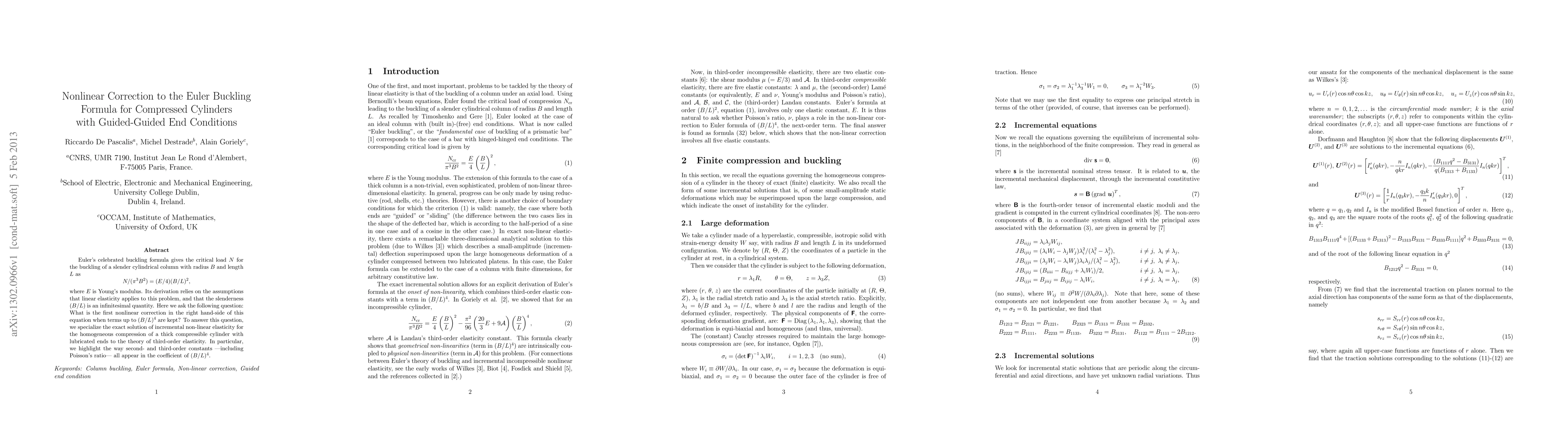 This paper corrects Euler's buckling formula for compressed cylinders with guided-guided end conditions, finding a nonlinear correction term up to fourth order, which depends on Young's modulus, Poisson's ratio, and the cylinder's dimensions.