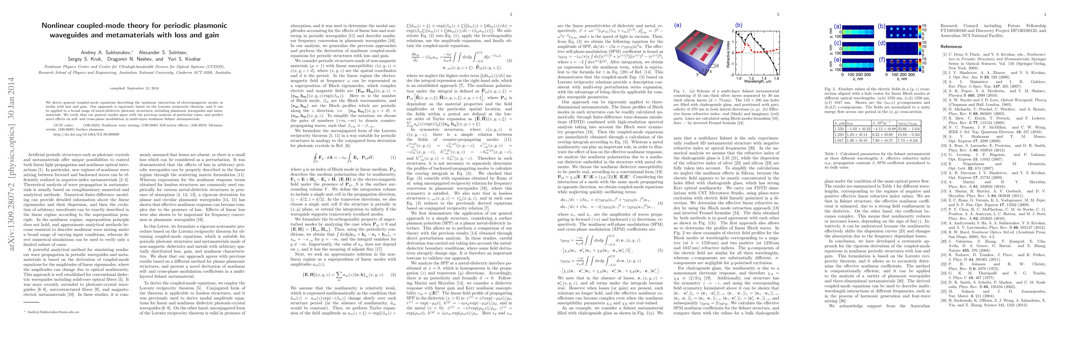 This paper develops coupled-mode equations for nonlinear interactions in plasmonic waveguides and metamaterials, grounded in the Lorentz reciprocity theorem, and predicts novel effects like self- and cross-phase modulation in multi-layer nonlinear fishnet metamaterials. The approach is validated against previous analyses and applicable to various metal-dielectric photonic structures.