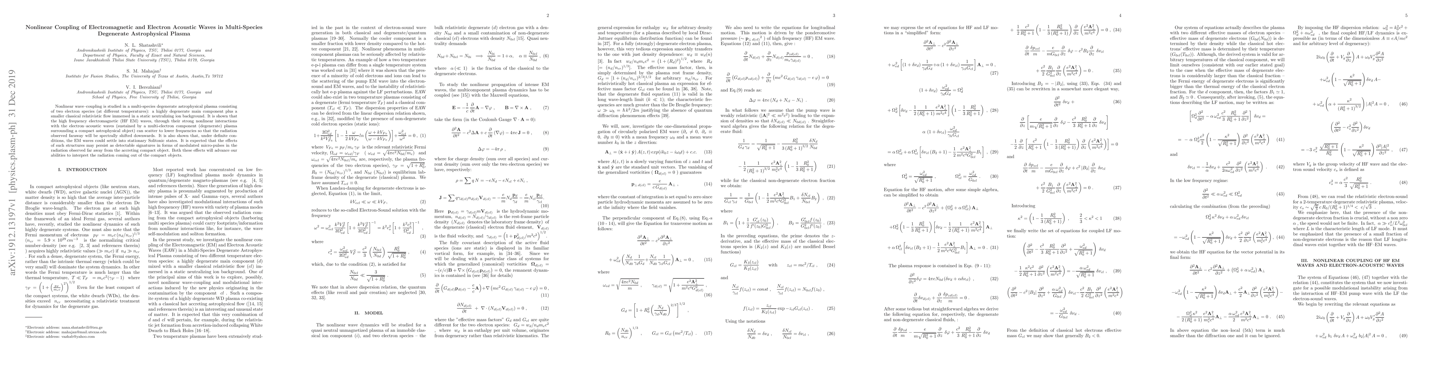 Nonlinear wave--coupling is studied in a multi-species degenerate astrophysical plasma consisting of two electron species (at different temperatures): a highly degenerate main component plus a smaller classical relativistic flow immersed in a static neutralizing ion background. It is shown that the high frequency electromagnetic (HF EM) waves, through their strong nonlinear interactions with the electron--acoustic waves (sustained by a multi-electron component (degenerate) plasma surrounding a compact astrophysical object) can scatter to lower frequencies so that the radiation observed faraway will be spectrally shifted downwards. It is also shown that, under definite conditions, the EM waves could settle into stationary Solitonic states. It is expected that the effects of such structures may persist as detectable signatures in forms of modulated micro-pulses in the radiation observed far away from the accreting compact object. Both these effects will advance our abilities to interpret the radiation coming out of the compact objects.