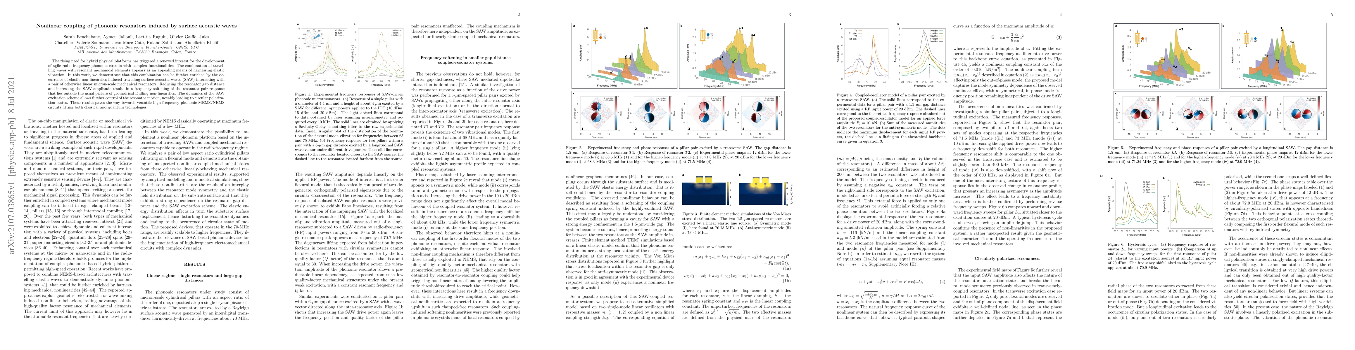 This paper demonstrates the nonlinear coupling of phononic resonators via surface acoustic waves, showing that increased SAW amplitude and reduced resonator gap distance induce frequency softening beyond typical Duffing non-linearities. The study highlights the potential for versatile high-frequency phononic circuits in both classical and quantum technologies.