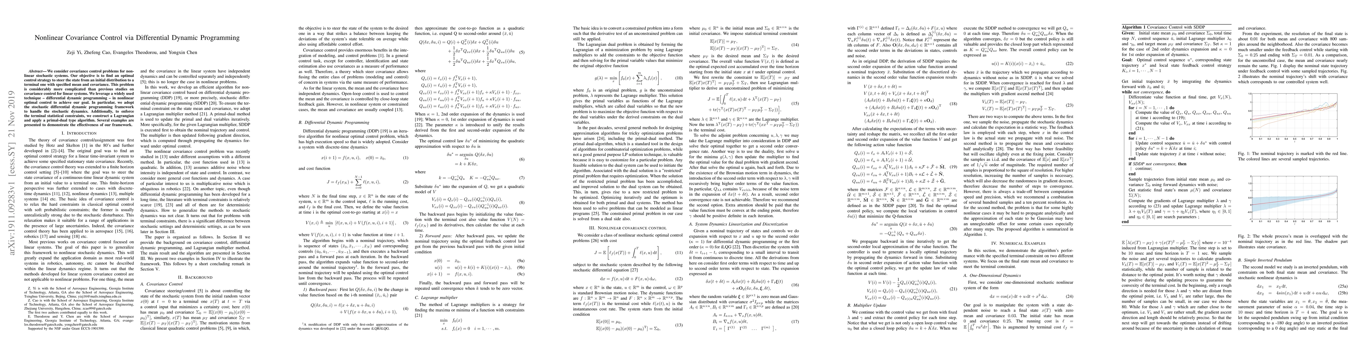 We consider covariance control problems for nonlinear stochastic systems. Our objective is to find an optimal control strategy to steer the state from an initial distribution to a terminal one with specified mean and covariance. This problem is considerably more complicated than previous studies on covariance control for linear systems. We leverage a widely used technique - differential dynamic programming - in nonlinear optimal control to achieve our goal. In particular, we adopt the stochastic differential dynamic programming framework to handle the stochastic dynamics. Additionally, to enforce the terminal statistical constraints, we construct a Lagrangian and apply a primal-dual type algorithm. Several examples are presented to demonstrate the effectiveness of our framework.