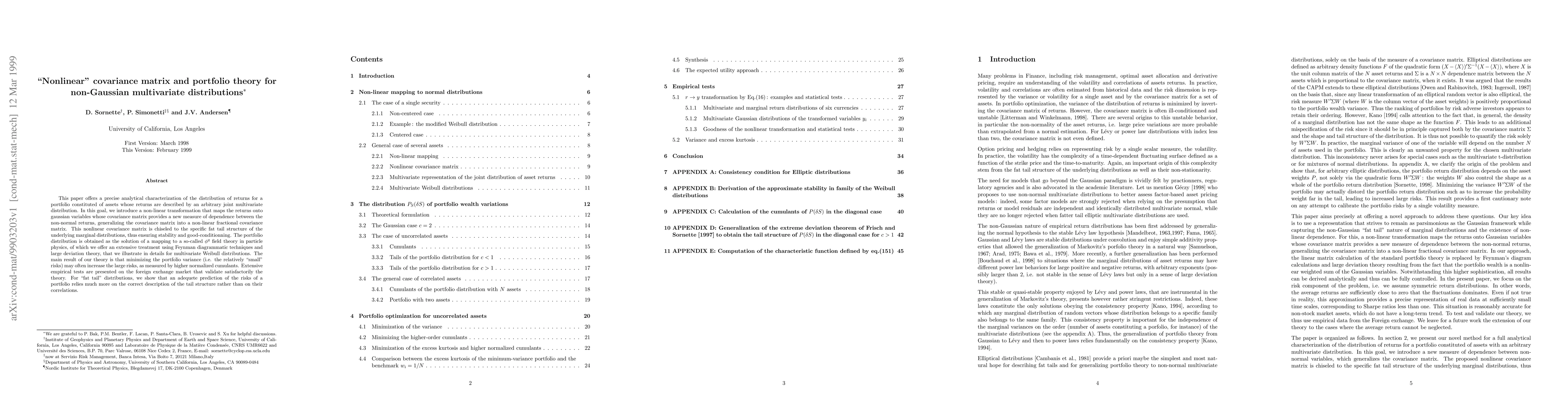 This paper offers a precise analytical characterization of the distribution of returns for a portfolio constituted of assets whose returns are described by an arbitrary joint multivariate distribution. In this goal, we introduce a non-linear transformation that maps the returns onto gaussian variables whose covariance matrix provides a new measure of dependence between the non-normal returns, generalizing the covariance matrix into a non-linear fractional covariance matrix. This nonlinear covariance matrix is chiseled to the specific fat tail structure of the underlying marginal distributions, thus ensuring stability and good-conditionning. The portfolio distribution is obtained as the solution of a mapping to a so-called phi-q field theory in particle physics, of which we offer an extensive treatment using Feynman diagrammatic techniques and large deviation theory, that we illustrate in details for multivariate Weibull distributions. The main result of our theory is that minimizing the portfolio variance (i.e. the relatively ``small'' risks) may often increase the large risks, as measured by higher normalized cumulants. Extensive empirical tests are presented on the foreign exchange market that validate satisfactorily the theory. For ``fat tail'' distributions, we show that an adequete prediction of the risks of a portfolio relies much more on the correct description of the tail structure rather than on their correlations.