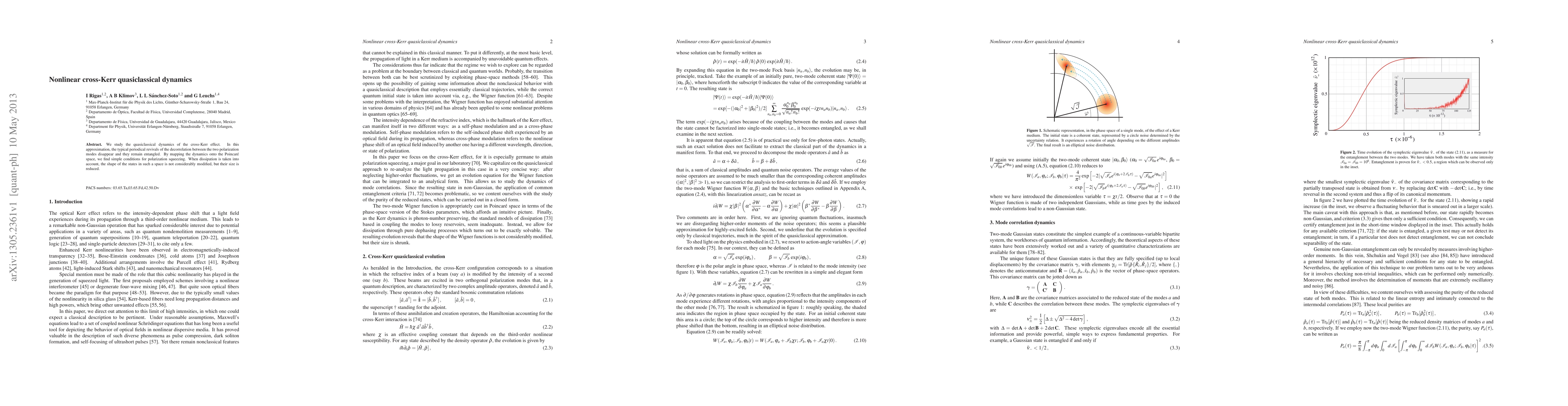 This paper investigates the quasiclassical dynamics of the cross-Kerr effect, revealing persistent entanglement without periodic decorrelation revivals. It maps the dynamics onto Poincare space, identifying conditions for polarization squeezing, and notes that while dissipation alters state size, their shape remains largely unchanged.