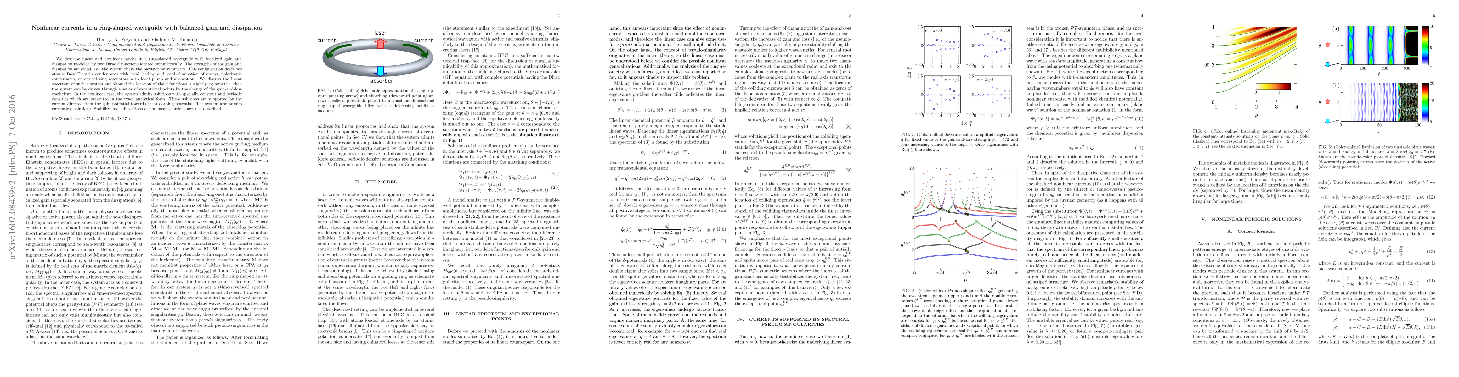 This paper investigates linear and nonlinear modes in a ring-shaped waveguide with balanced gain and dissipation, modeled by symmetrical Dirac $\delta$ functions. It explores the system's linear spectrum and nonlinear solutions, including spatially constant and periodic densities, driven by current from gain to loss, with stability and bifurcations discussed.