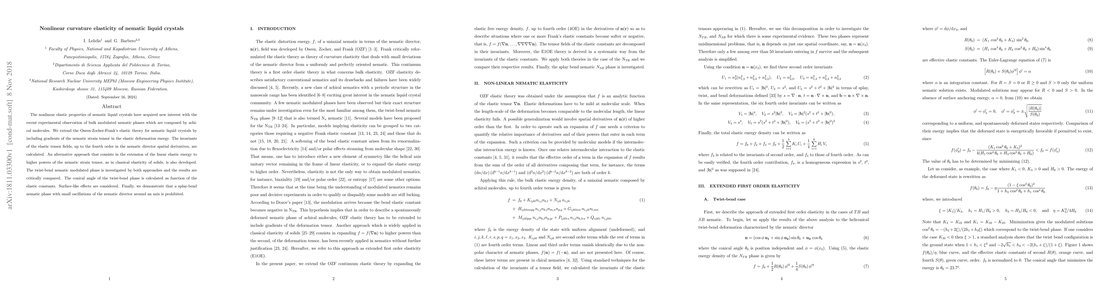 This paper extends the Oseen-Zocher-Frank's elastic theory for nematic liquid crystals by incorporating higher-order gradient terms and compares two approaches for modeling their nonlinear elastic properties, finding that the twist-bend nematic phase's conical angle depends on elastic constants, while a splay-bend phase is theoretically prohibited.