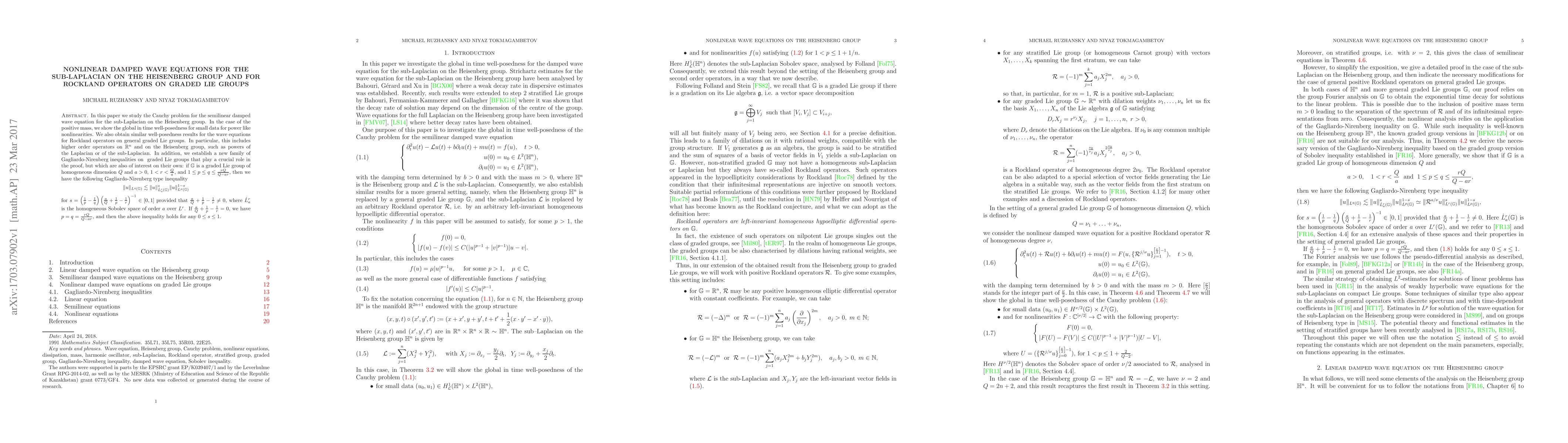 This paper investigates the Cauchy problem for semilinear damped wave equations associated with the sub-Laplacian on the Heisenberg group and Rockland operators on graded Lie groups, proving global well-posedness for small data. It also introduces new Gagliardo-Nirenberg inequalities on graded Lie groups, crucial for the proofs and of independent interest.